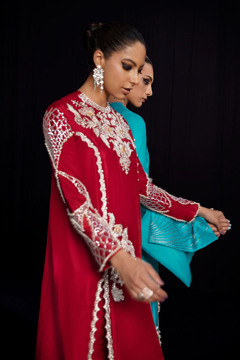 Long shirt in pure raw silk in ruby red color with embroidery in white thread and topped with heavy hand embellishment that includes pearls, Swarovski stones, dabka, 3d pipes, glittery gota pati. It is featured with two front slits in each panel showing off the plain red tailored cut bootcut pants. Focusing much on the details, slits have embellished borders too. Pants are made in pure Thai silk fabric. Sleeves have shiny sequined jaal with pearls outline. Dupatta with/without spray can be added on demand.