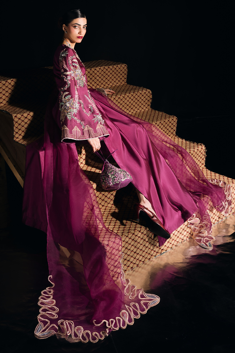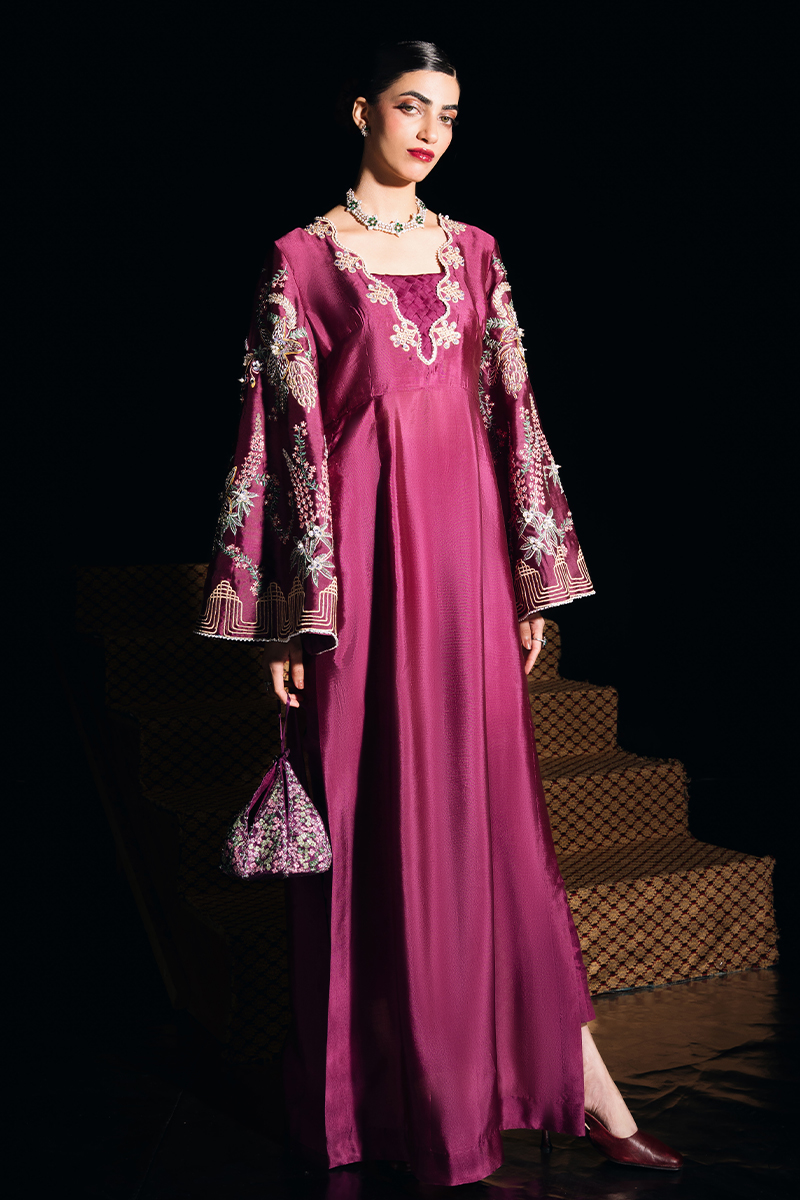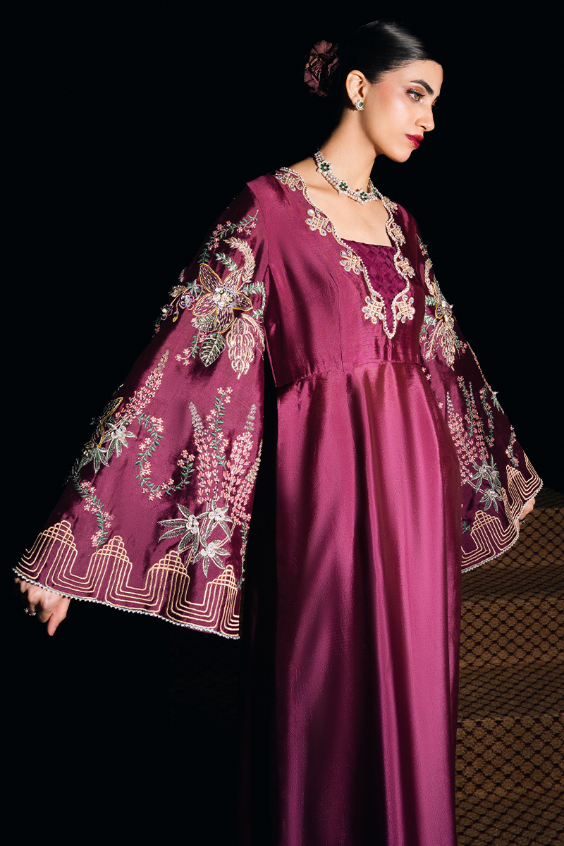 An elegant kaftan set paired with straight-fit trousers and an organza dupatta. Beautifully hand-embroidered and embellished with dabka, crystals, sequins, and pearls, featuring a scalloped neckline and flared sleeves. The organza dupatta is finished with scalloped embroidered borders on all sides.