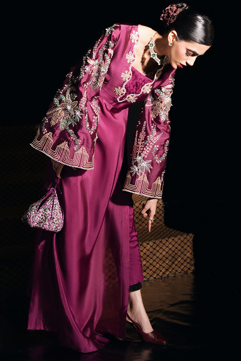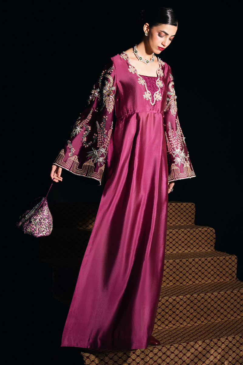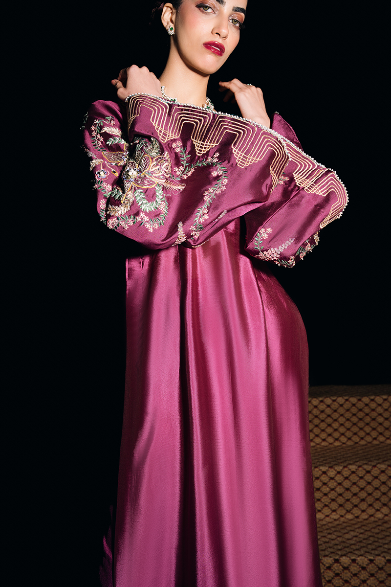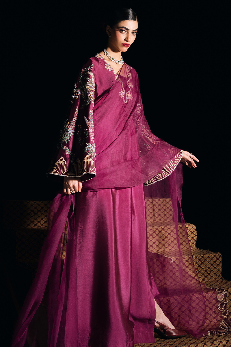An elegant kaftan set paired with straight-fit trousers and an organza dupatta. Beautifully hand-embroidered and embellished with dabka, crystals, sequins, and pearls, featuring a scalloped neckline and flared sleeves. The organza dupatta is finished with scalloped embroidered borders on all sides.
