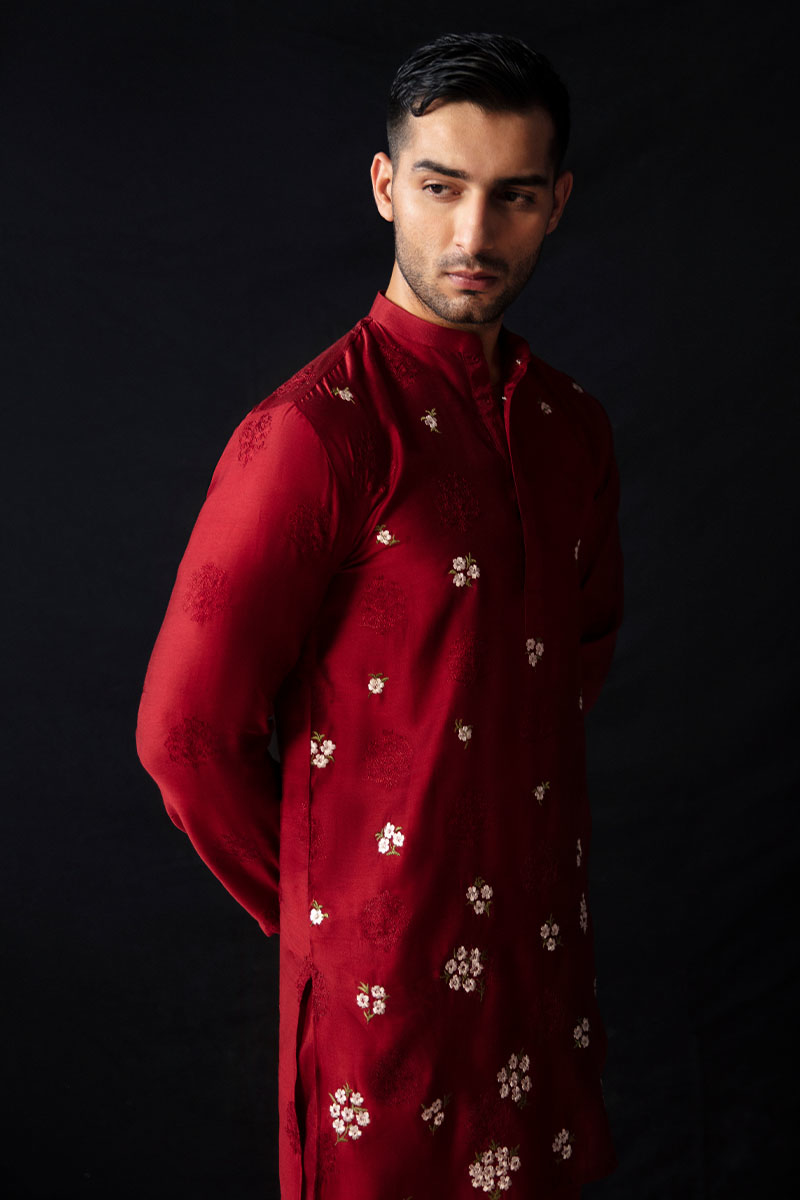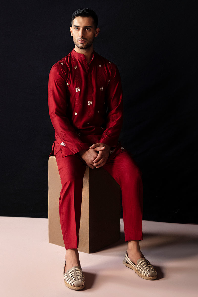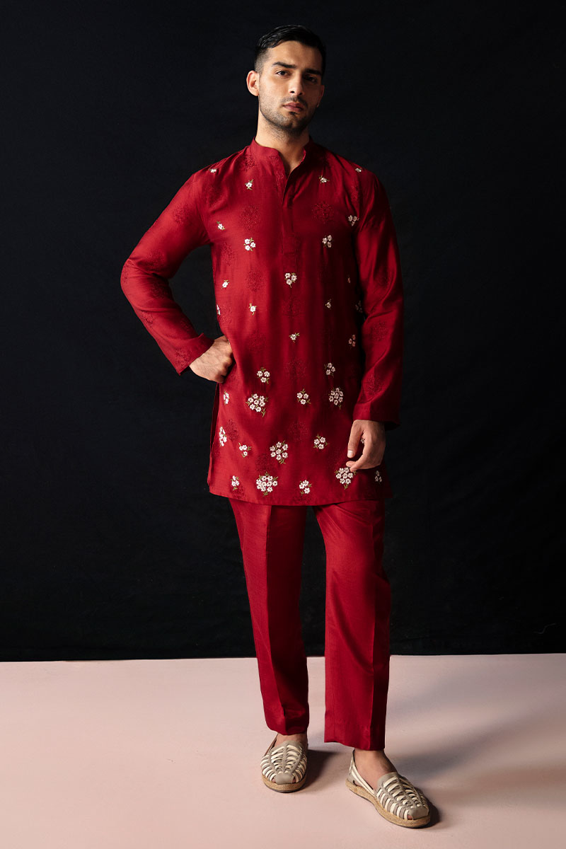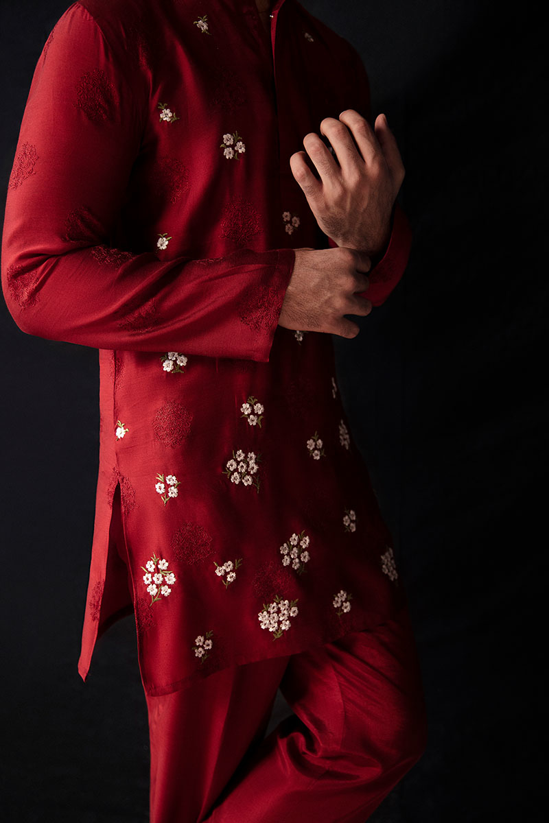 A marvelous outfit, "Love Note" in Blood Red features an embroidered straight fit mid thigh paper silk kurta with a neck band, cuff, and front placket detail, paired with relaxed fit Thai silk trousers. The exquisitely machine embroidered florals on the kurta add intricate details that make the outfit absolutely wonderful.