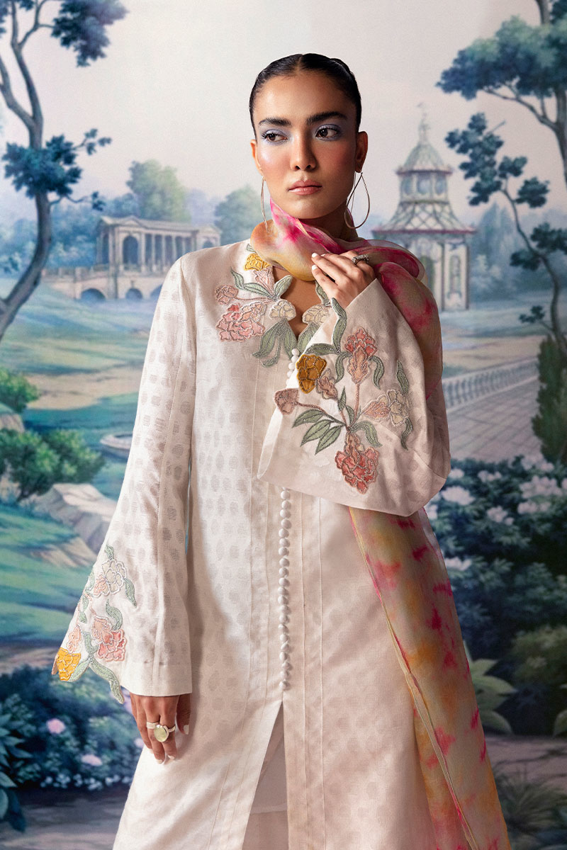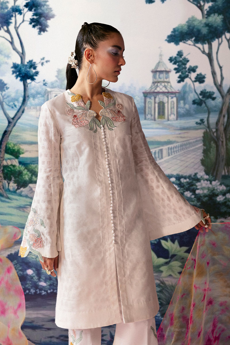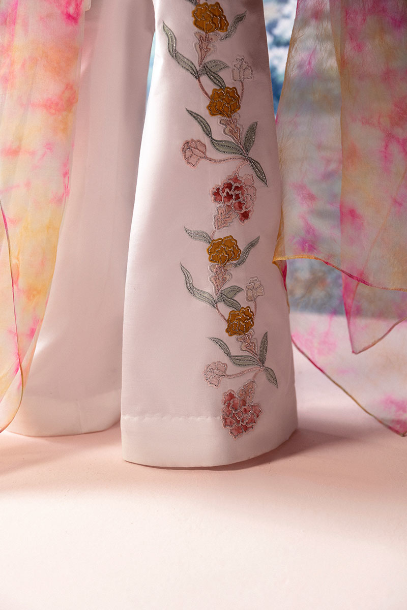 Embrace the romance of "Love Stitch" where every detail whispers elegance. A V-neck shirt adorned with pin pleats and front slit detail, paired with graceful bell sleeves and a chic bootcut trouser. Intricate patchwork graces the neckline, sleeves, and trousers, while a tie-dye Organza dupatta adds a touch of ethereal charm. Perfect for those who cherish timeless beauty with a hint of whimsy.