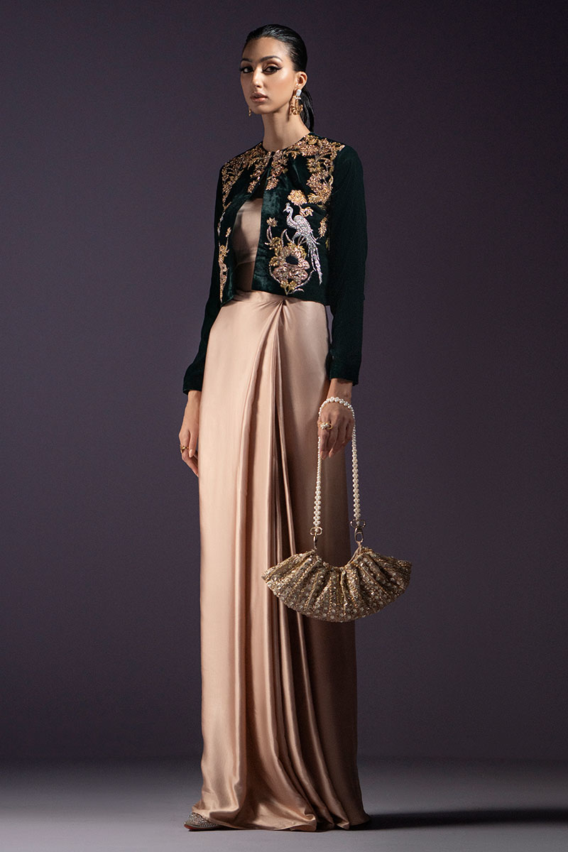 Behold this stunning ensemble 'LURE', featuring an astonishing dark green velvet jacket adorned with intricate embroideries paired with a silk-draped dress in a soft peach hue, weaving tales of sophistication and style.