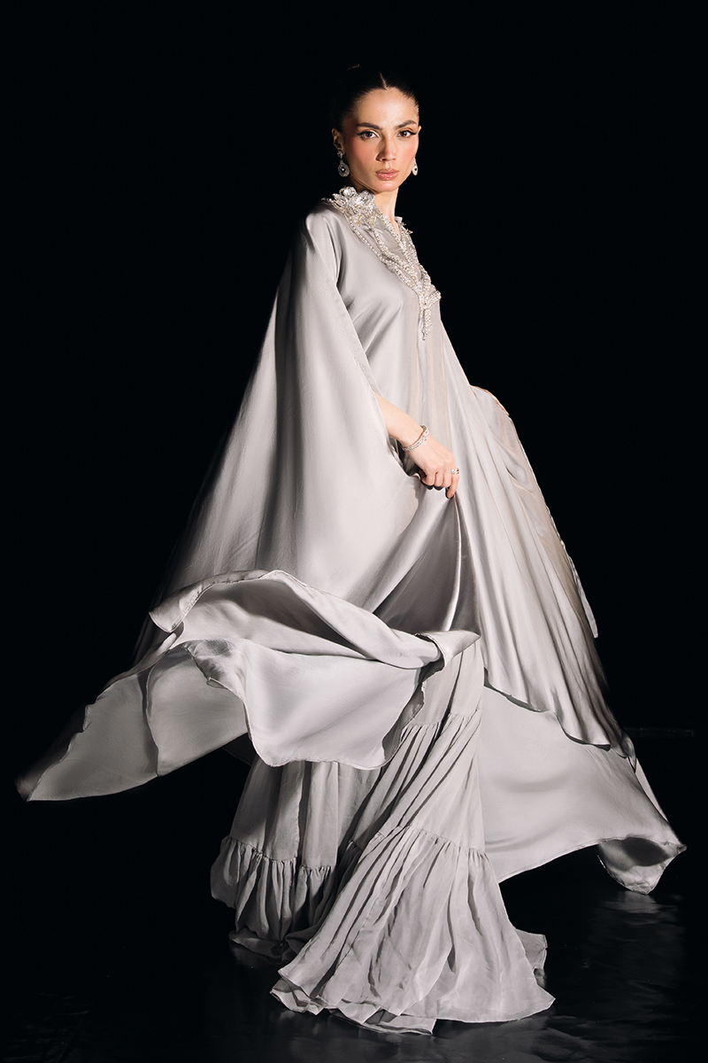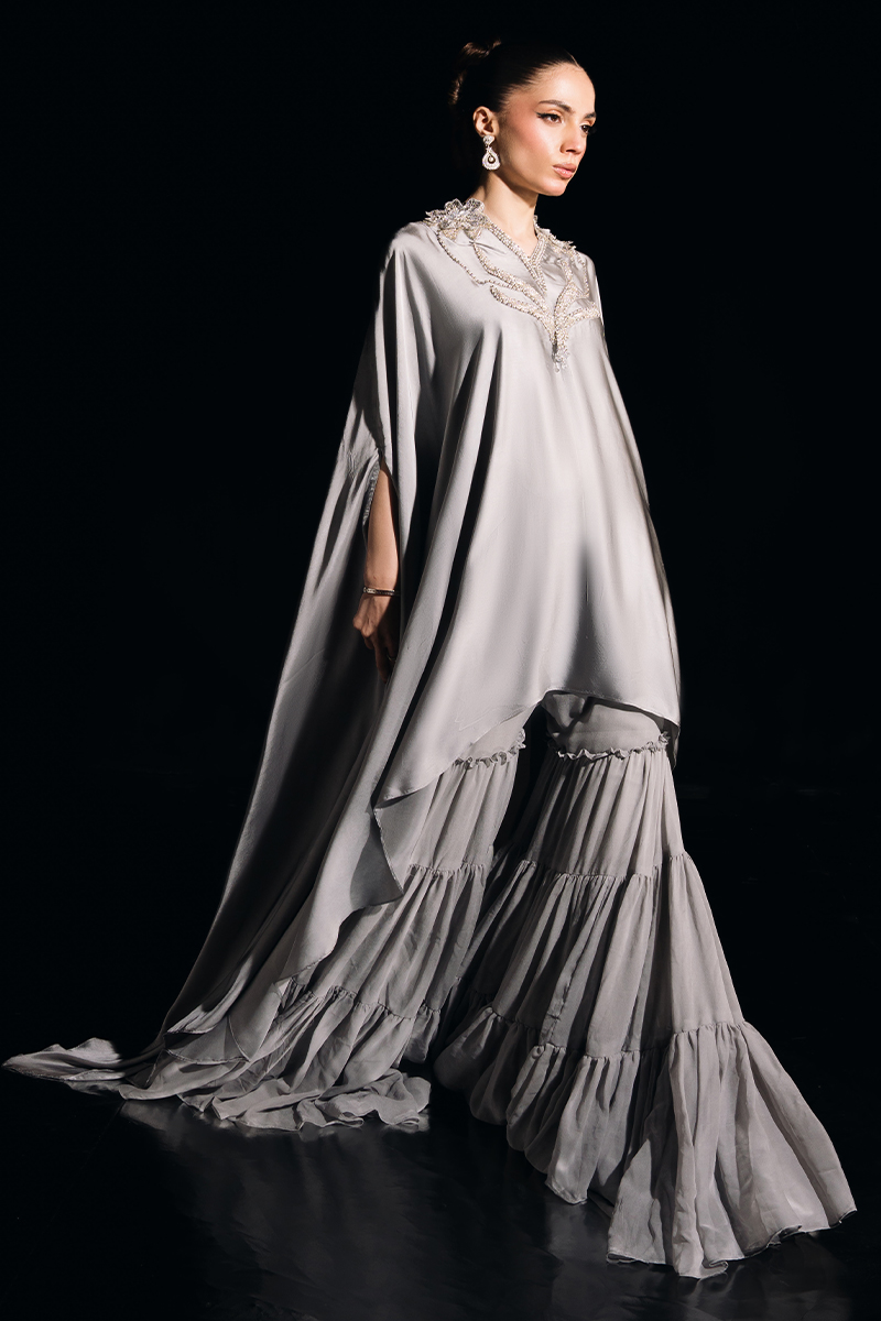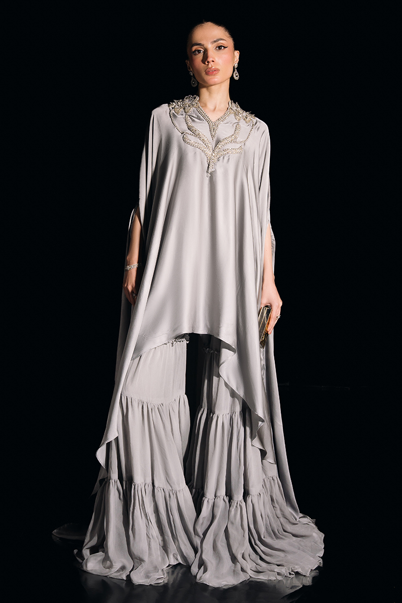 A flowy high-low kimono-inspired shirt paired with three-tiered flared sharara pants. The kimono features an exquisite hand-embellished neckline enhanced with Swarovski crystals, sequins, and pearls for a refined, statement finish.