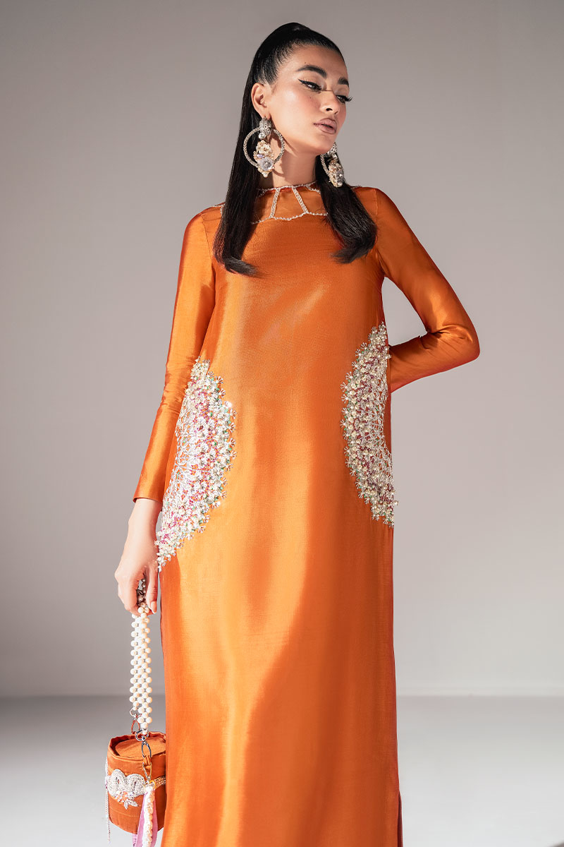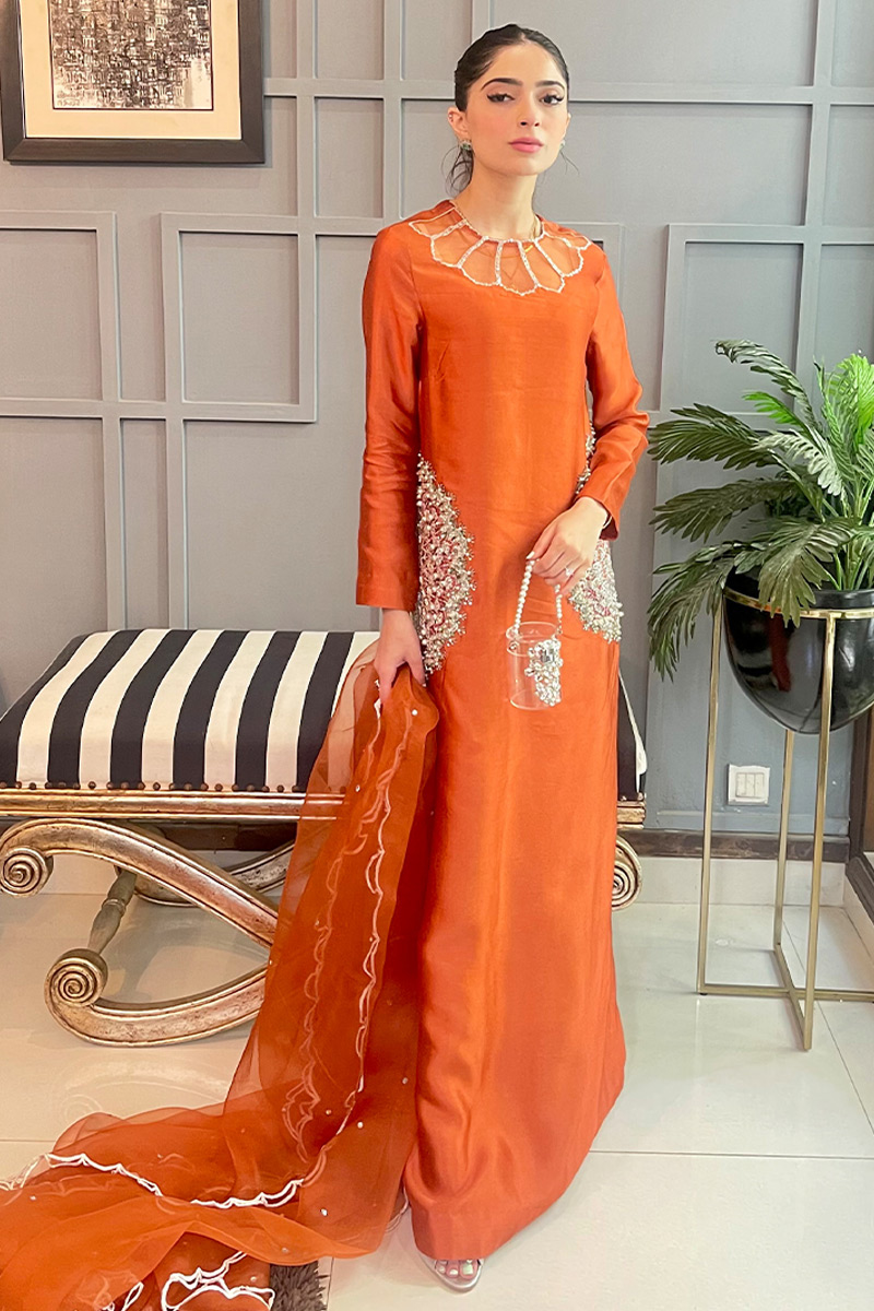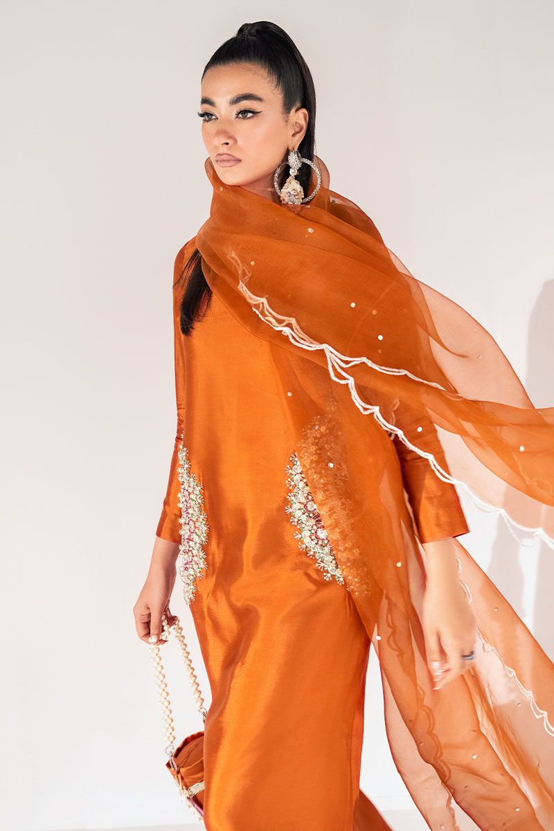 Crafted from the finest quality fabric, this rust orange long and chic Kaftaan shirt with short side slits is a true masterpiece. The silver embellishments add a touch of luxury to the outfit; it has two heavily embellished motifs on the sides with the modern detailed neckline. Perfected with the organza dupatta with a white border adds a touch of sophistication.