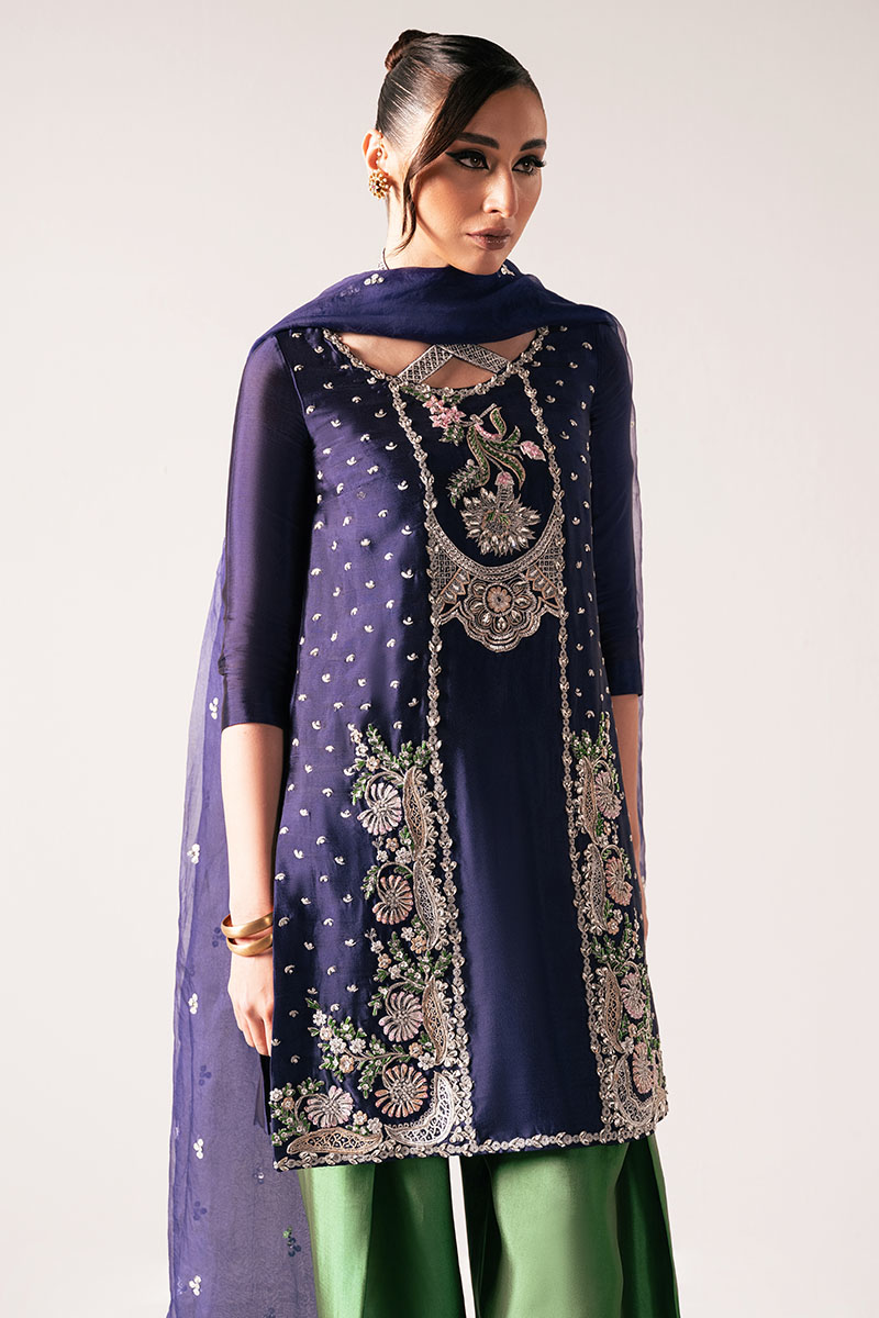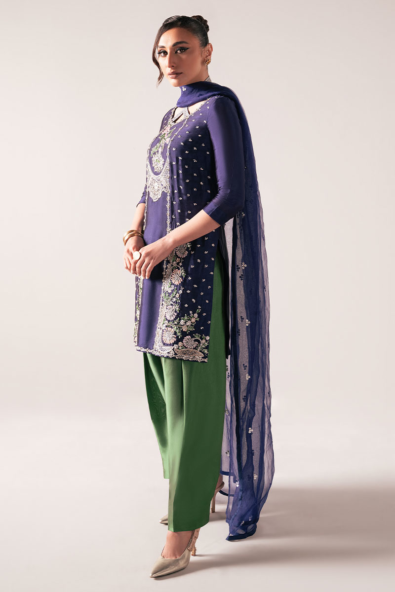 "Manto": a regal ensemble crafted from luxurious tissue silk. Adorned with intricate embellishments, the short shirt features a round neckline and three-quarter fitted sleeves, exuding timeless elegance. Paired with a pleated shalwar in rich green and complemented by an organza heavy sequins spray dupatta, "Manto" embodies sophistication and grace, making it a true statement.