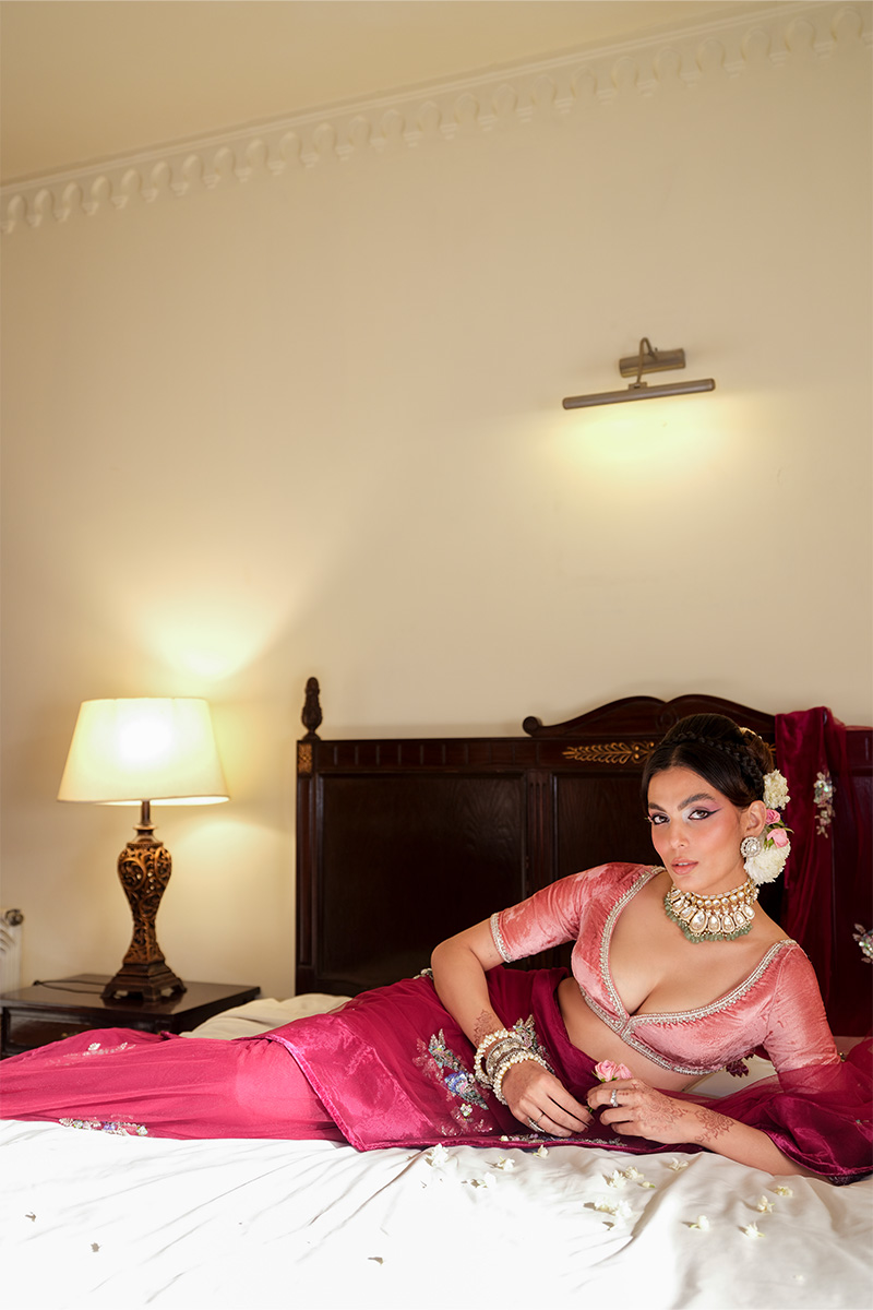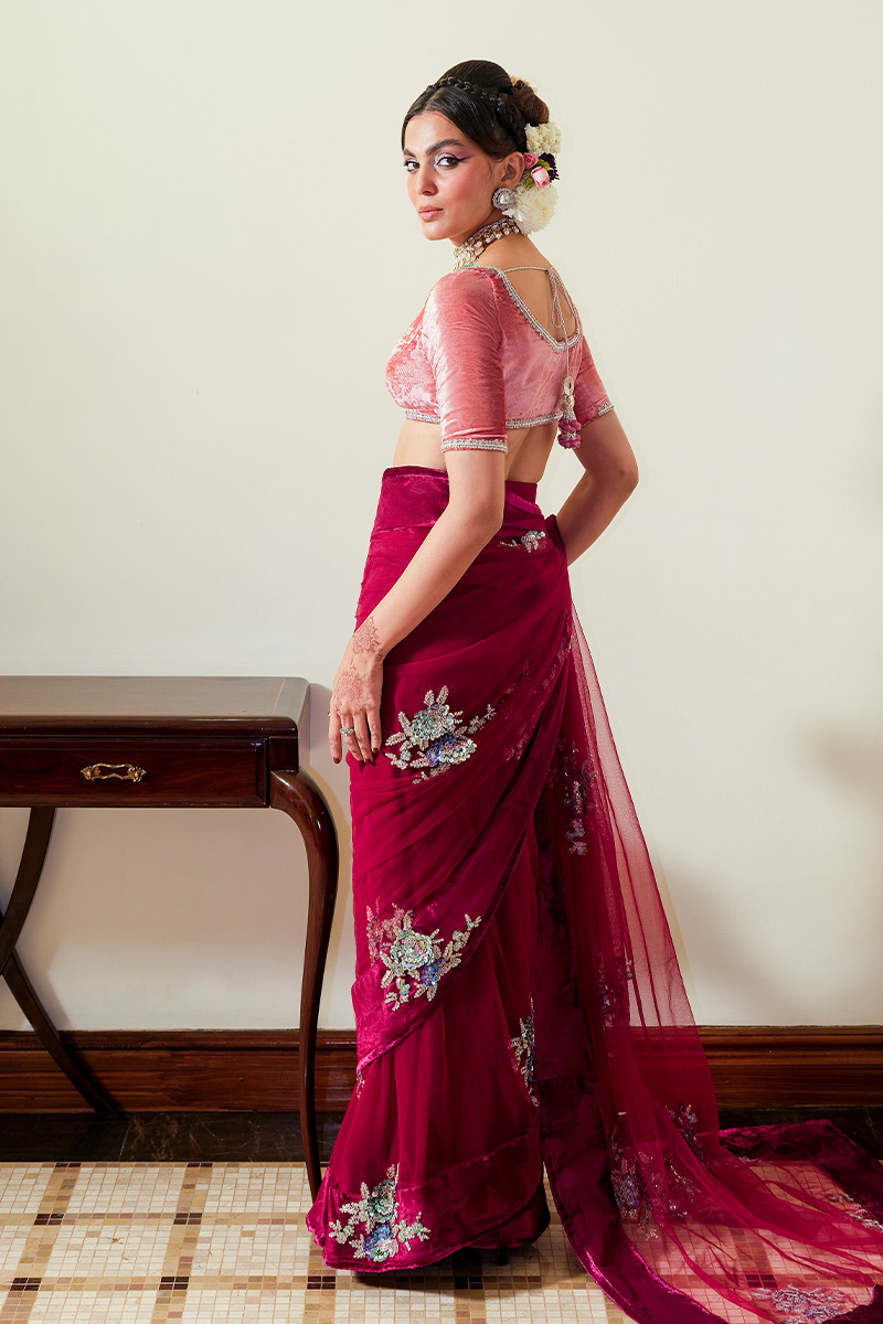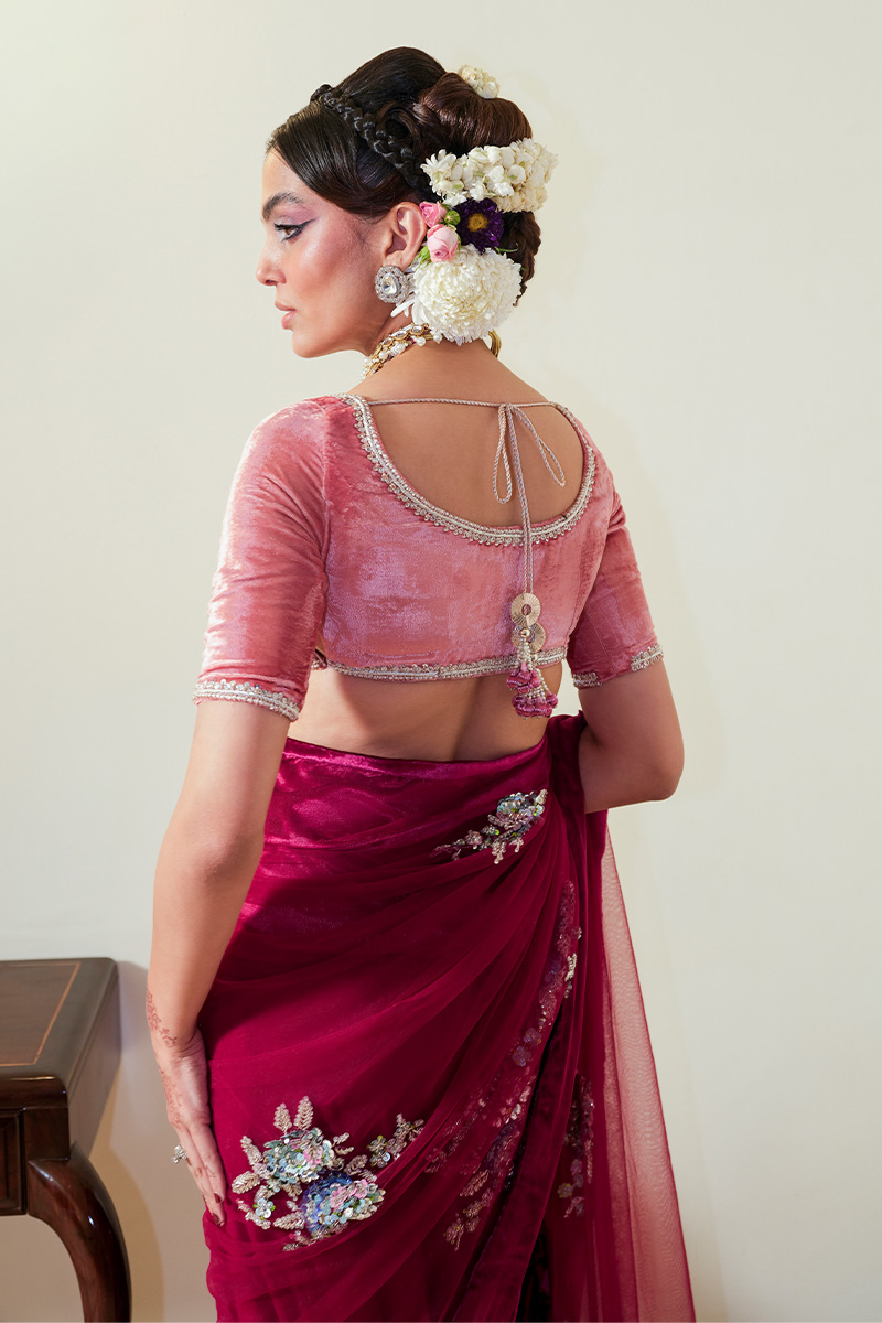 Mastani - In a dreamy blend of tea pink and deep plum, Mastani is a vision of refined grace. The velvet blouse features a deep V-neckline with delicately hand-embellished edgings, radiating timeless sophistication. Paired with a net sari adorned with hand-embellished floral bunches throughout and finished with a wide velvet border, this ensemble is the perfect balance of elegance and allure.