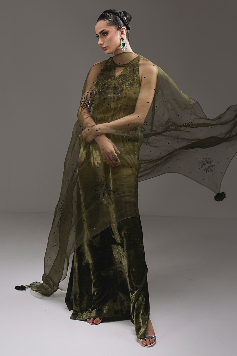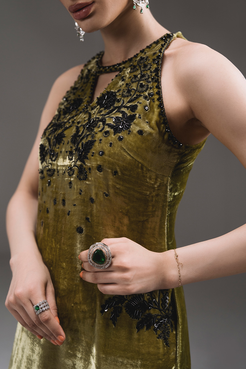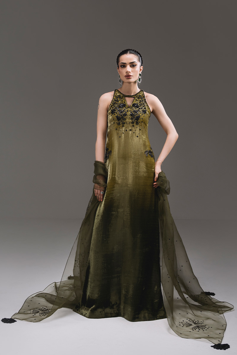 A striking halter-neck kaftan adorned with intricate embroidery and hand-embellished motifs, elevated by a soft ombré finish. The delicate front keyhole and statement embellished back motif add modern elegance to the flowing silhouette. Paired with an organza dupatta featuring shimmering sequin accents and tassel detailing for a graceful, festive finish.