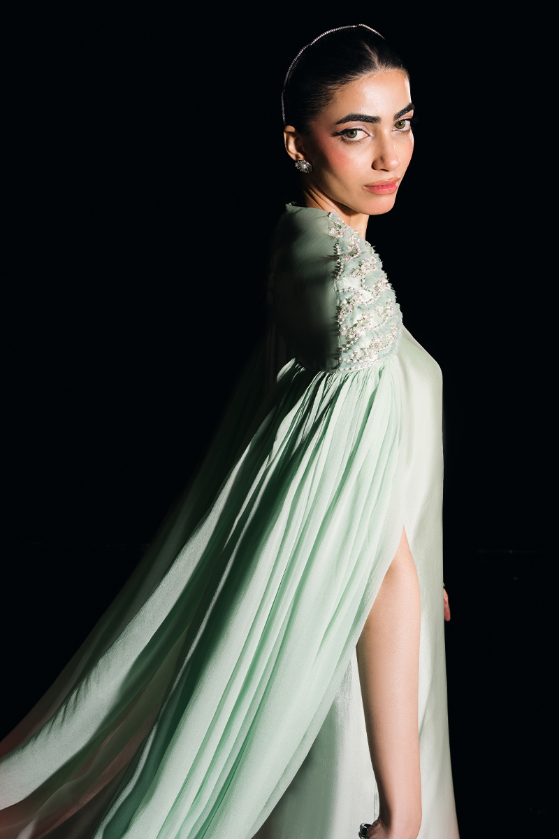 A floor-length sleeveless kaftan paired with a flowy cape in a soft ombré finish. The kaftan features a hand-embellished neckline, while the cape is adorned with intricate handwork, 3D net detailing, crystals, sequins, and pearls, elevated with a graceful ombré drape.