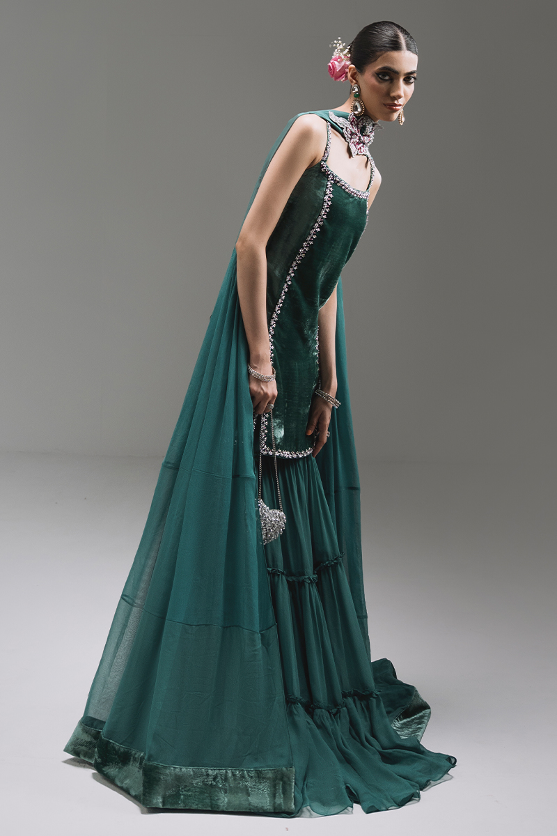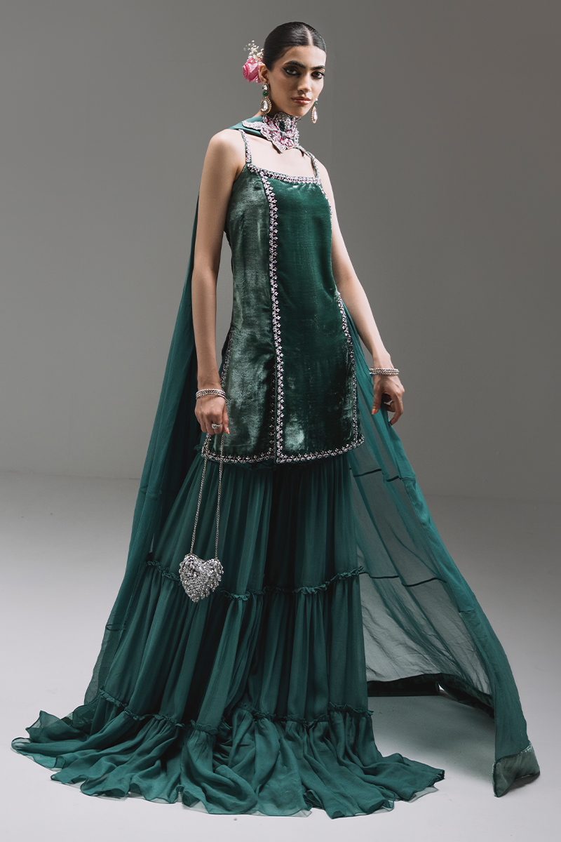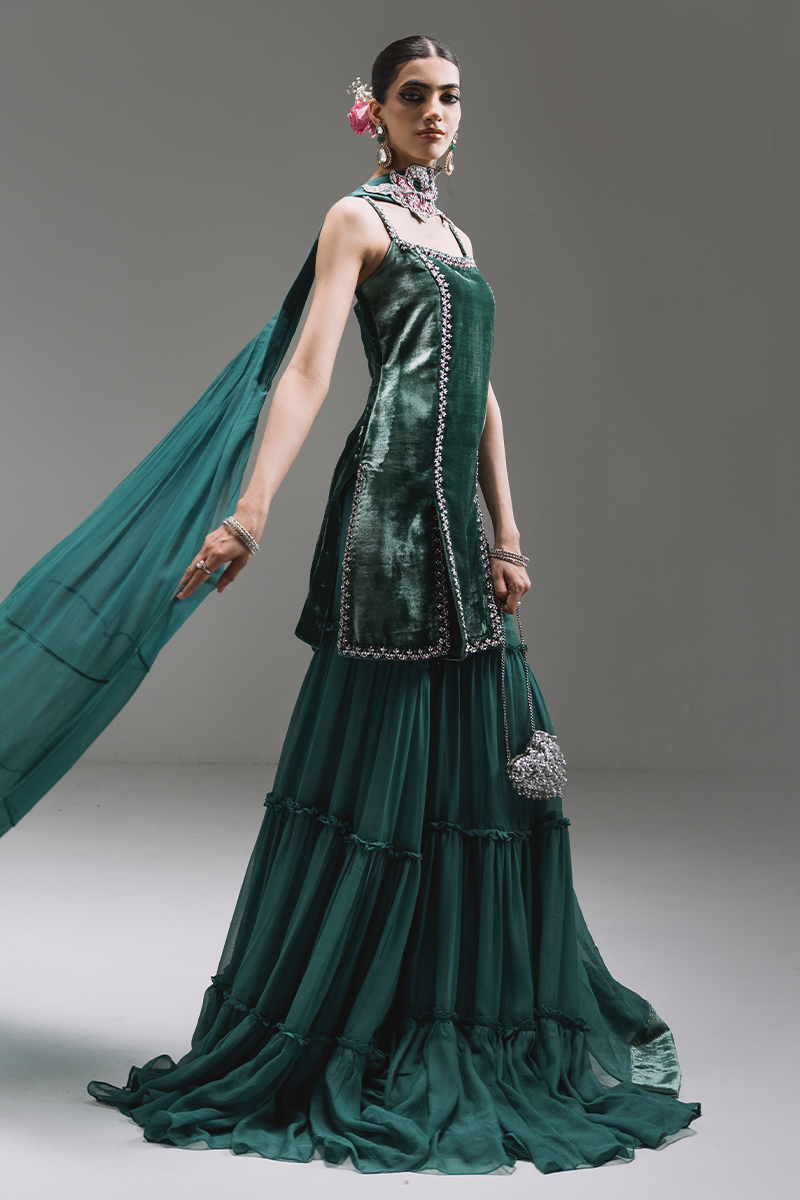 A modern spaghetti-strap short dress featuring refined hand embellishment along the front and an elegant slit for a sleek silhouette. The three-tier flared pants, detailed with delicate gathers and frill layers, bring movement and flair. Paired with a pleated chiffon dupatta with velvet detailing and a statement embellished neckline motif for a graceful finish.