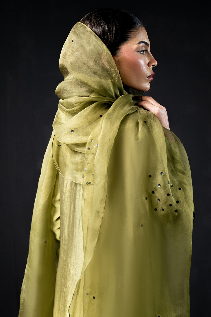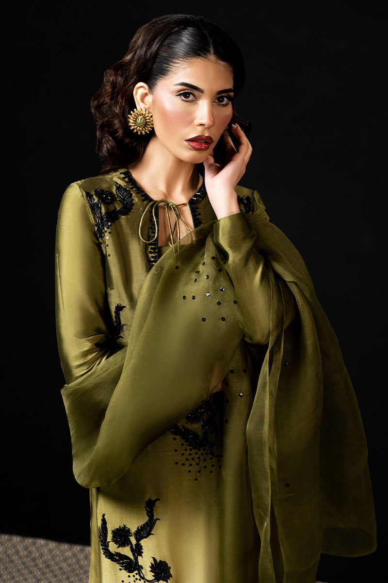 A stunning ensemble perfect for the festivities. The ombre Tissue Silk shirt features intricate black embellishments and a chic open neckline with tassels, paired effortlessly with Thai Silk culottes trousers. Complete the look with the lavish organza heavy sequins spray dupatta, exuding glamour and sophistication. Embrace the allure of "Mrs. Belle" and shine with unmatched grace and style.