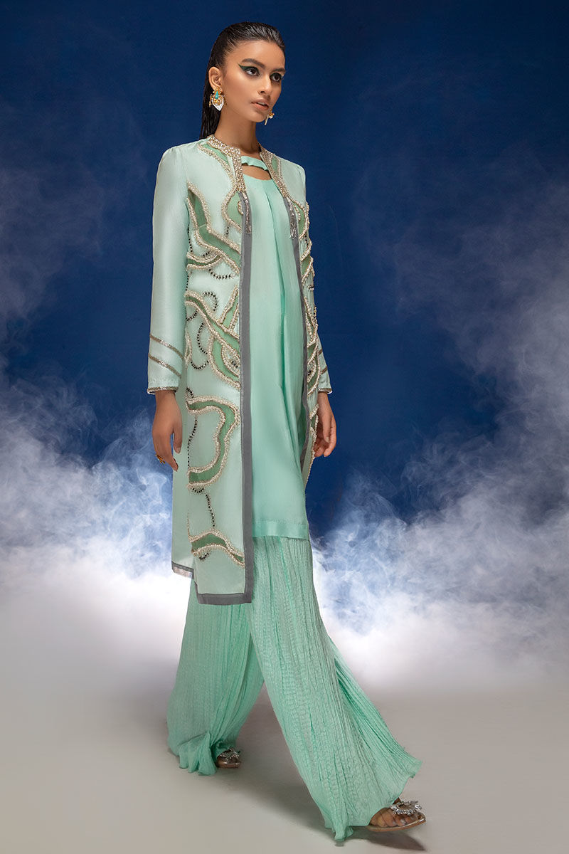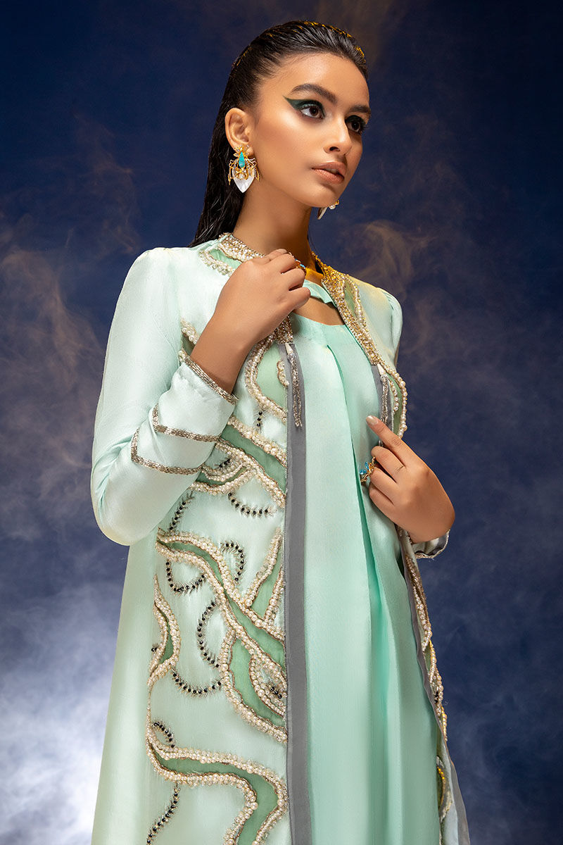 Front cropped straight raw silk jacket with crushed loose pants. Hand embellishment in waves of pearls and shiny crystals enhanced with black stones.