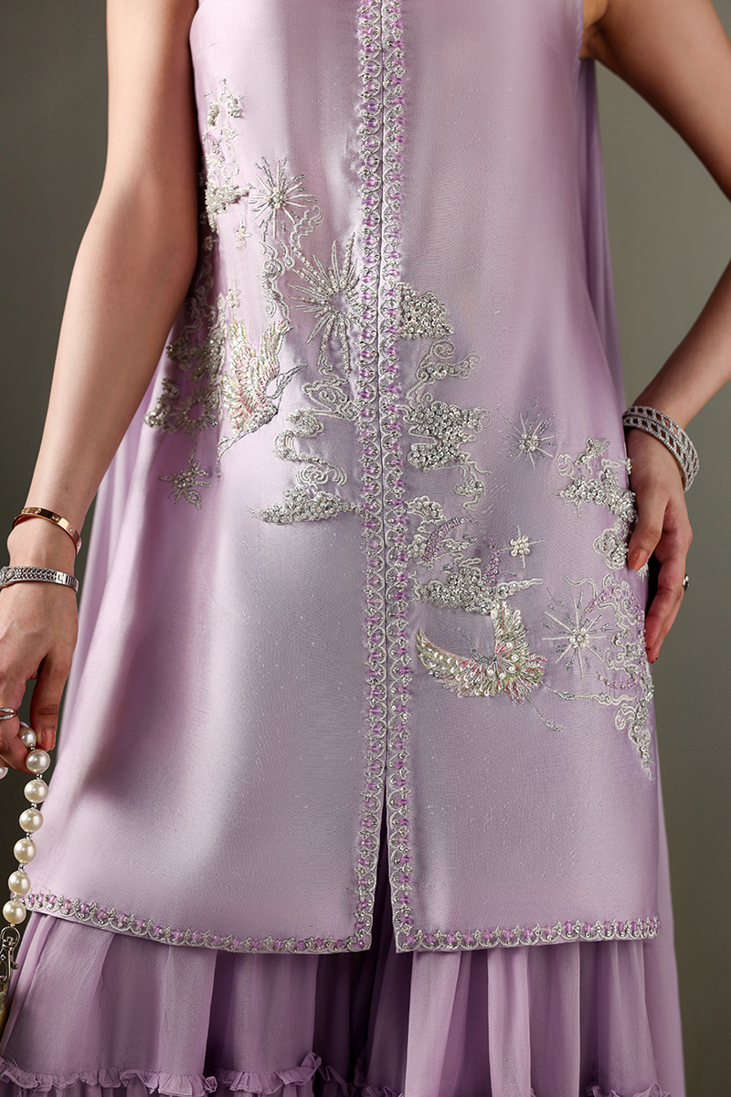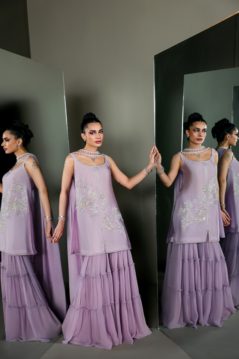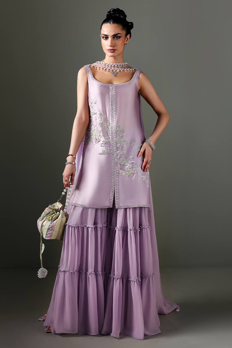 It includes shirt and dupatta. A short-length tissue silk shirt featuring a deep round neckline and asymmetrical embellishment work.Adorned with shimmering details using fine, luxurious materials for a modern festive look.Paired with a pleated chiffon dupatta finished with delicate neck tassels.