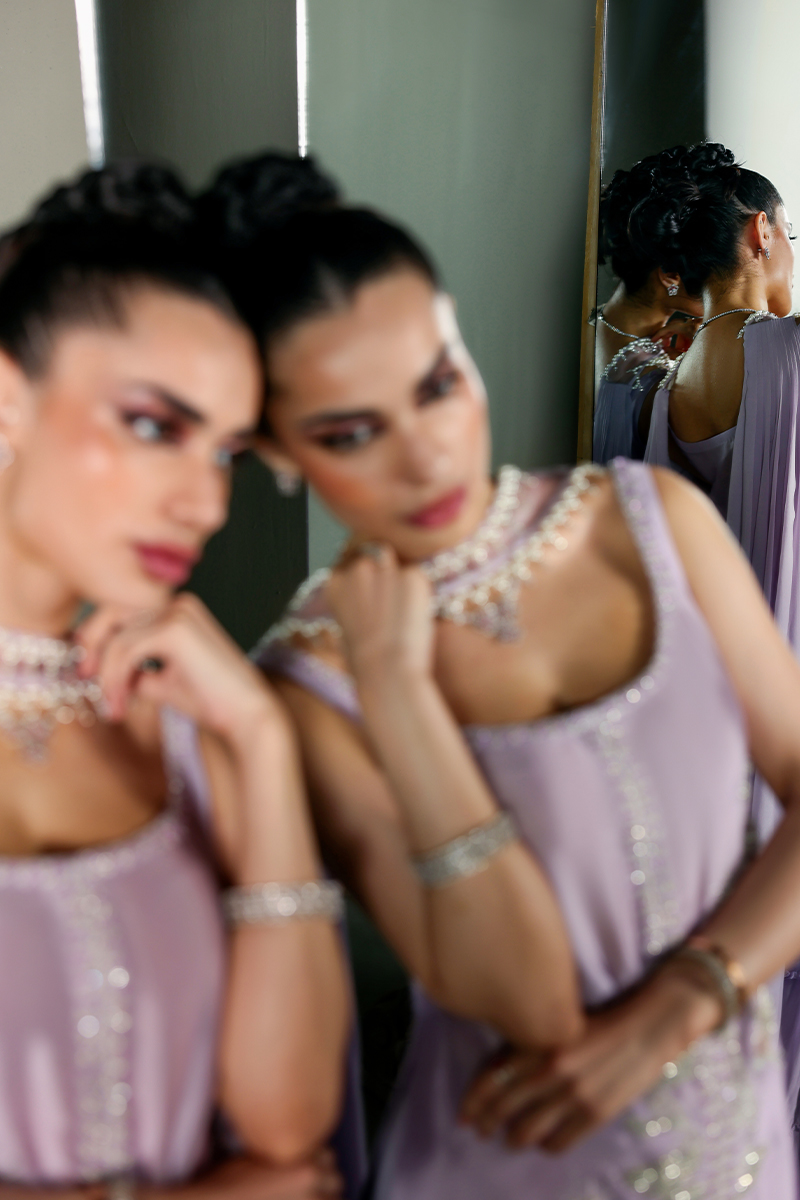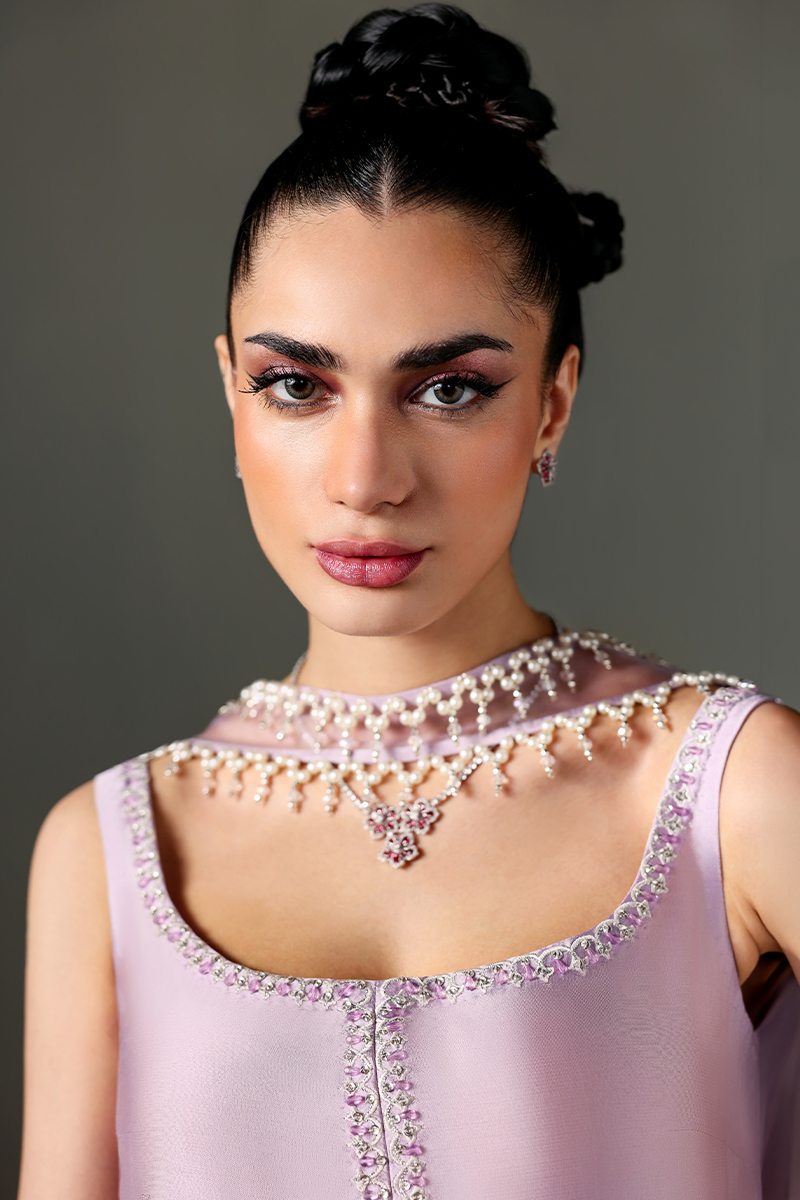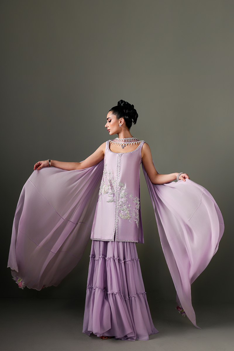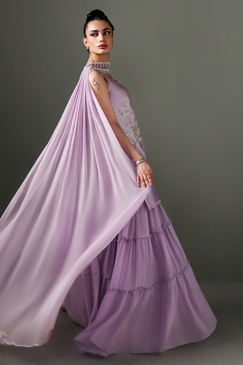 It includes shirt and dupatta. A short-length tissue silk shirt featuring a deep round neckline and asymmetrical embellishment work.Adorned with shimmering details using fine, luxurious materials for a modern festive look.Paired with a pleated chiffon dupatta finished with delicate neck tassels.