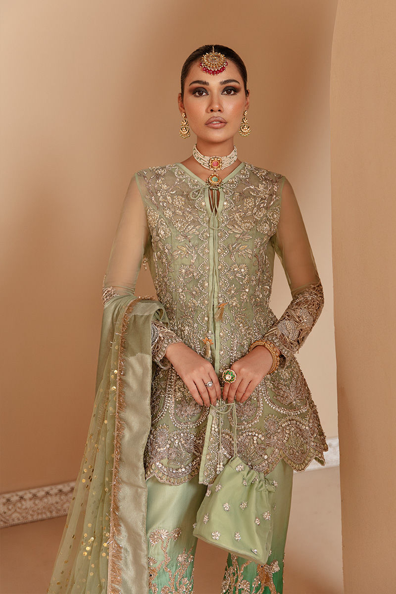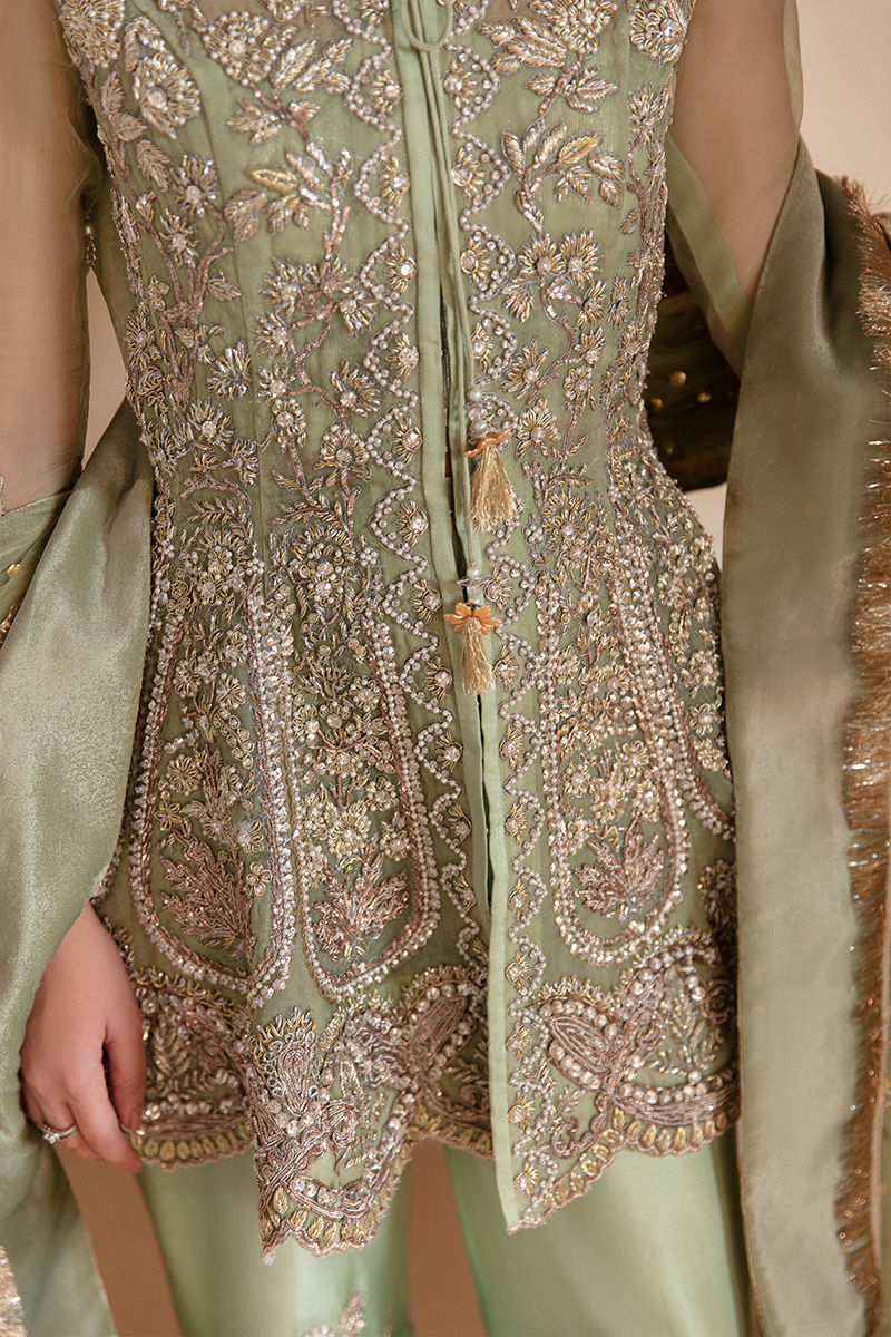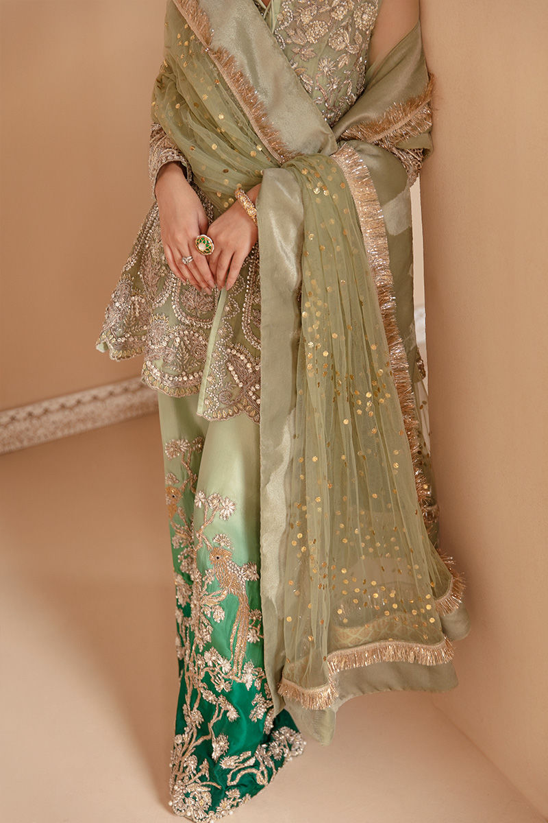 Naimat is inspired by nature’s beauty executed in the hues of green. The pista green peplum is exquisitely cut with 12 panels in total and a front open feature. It is all made in Pure organza fabric with sleeves in organza too. Peplum is completely hand embellished with traditional embellishment techniques and materials. It is paired with pure raw silk culotte pants with an ombre of light and dark green. Sumptuously embellished pants with magnificent drawings. It comes with a pure gold kamdaani dupatta in mint color with velvet finishes on all four sides.