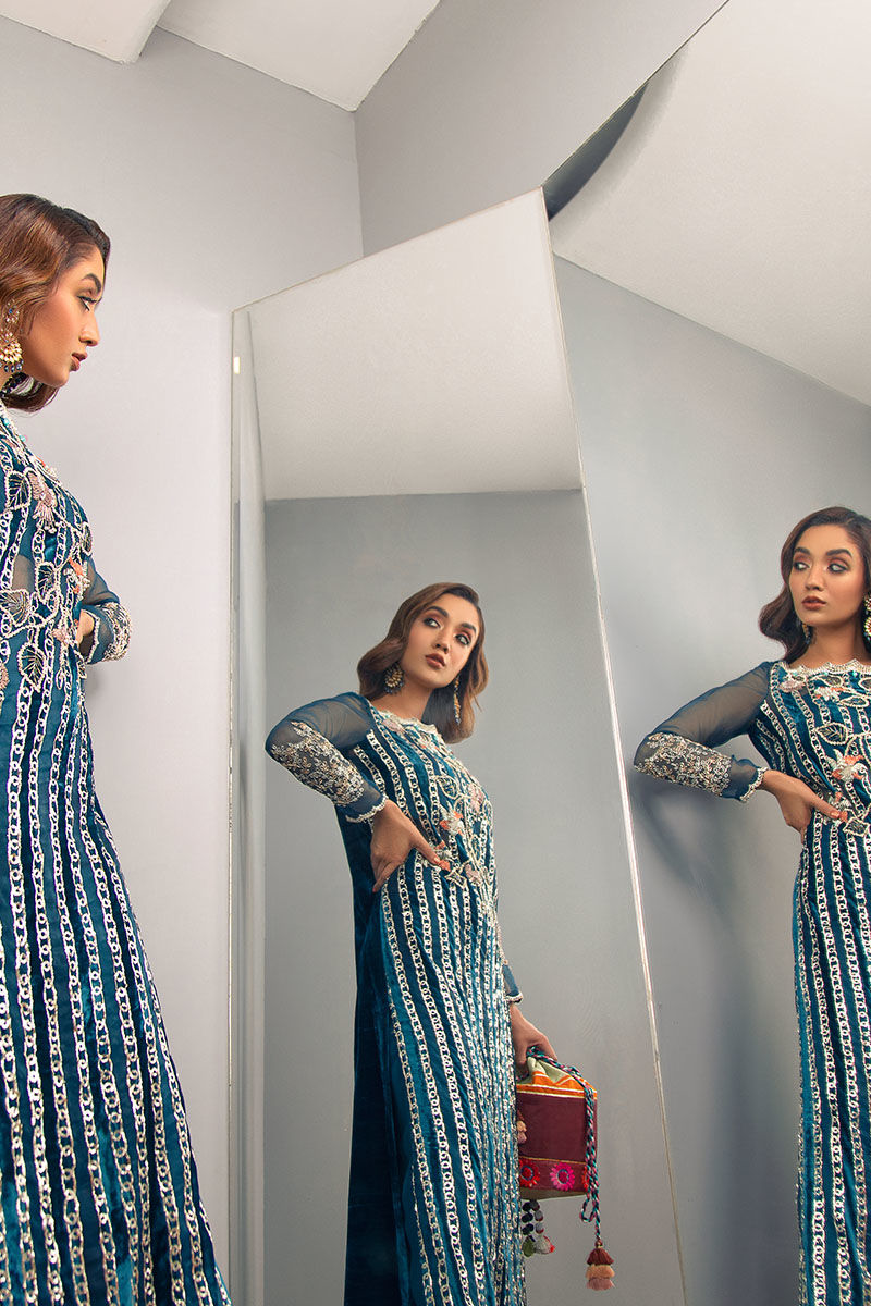 Full length slim fit shirt with wide ghera and fitted sleeves. Plazzo pants added! Hand embellishment in pita work and resham thread work