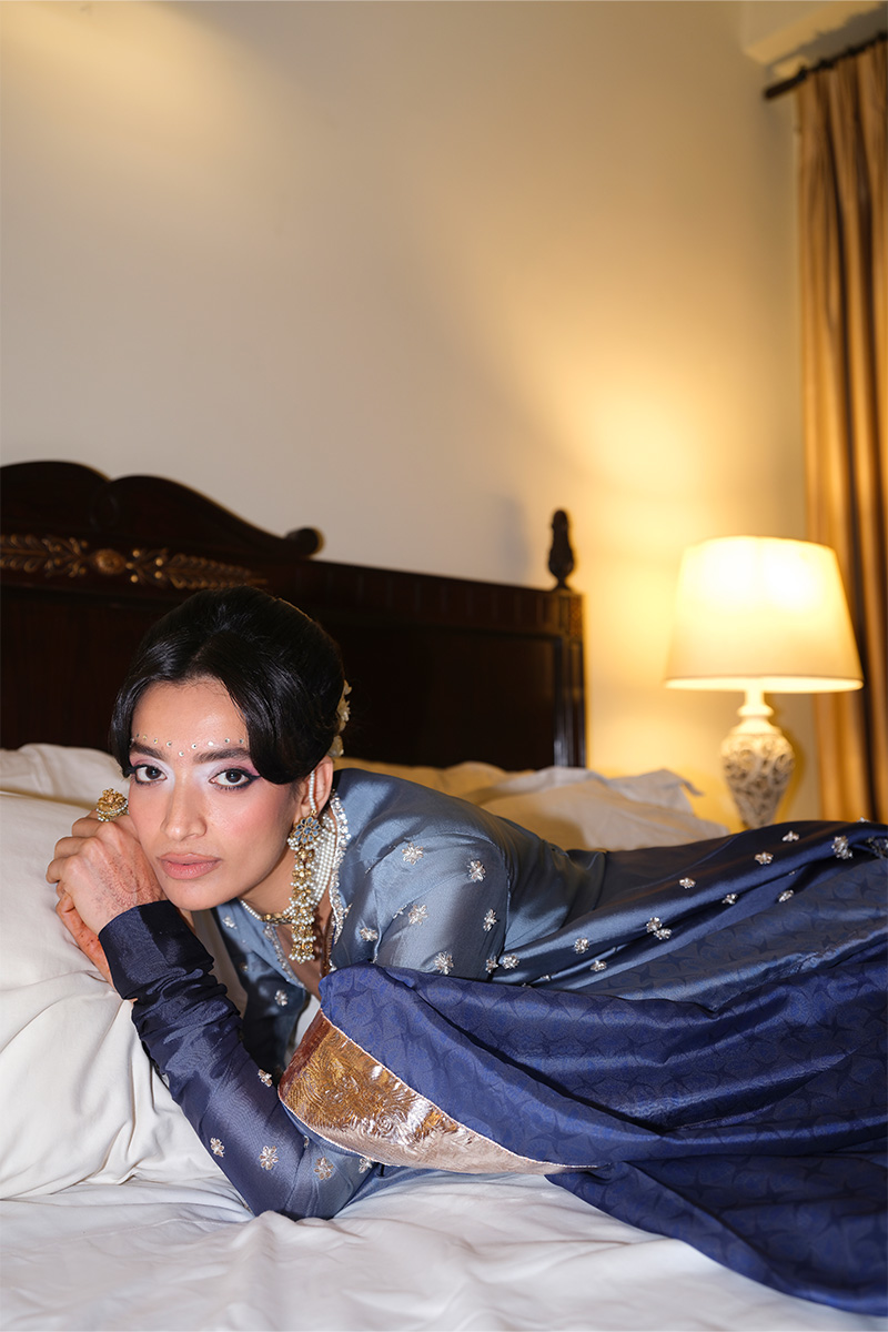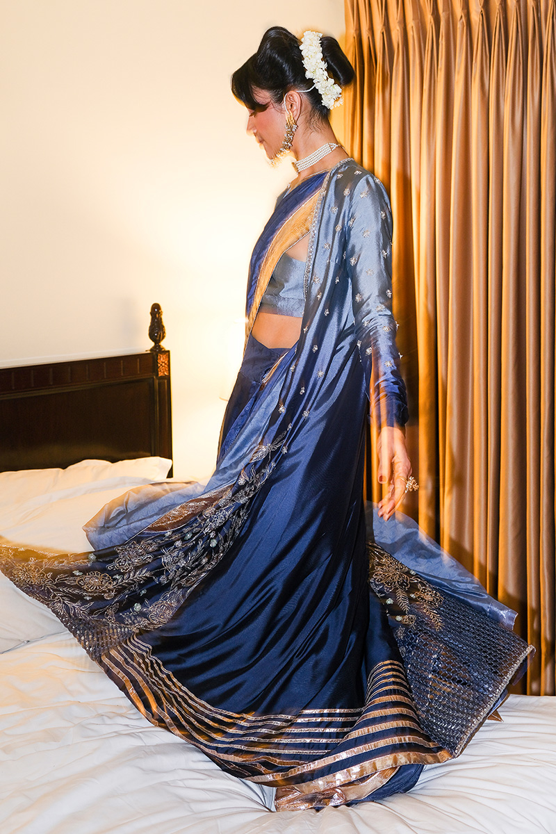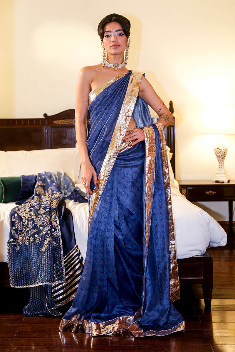 A striking fusion of tradition and grandeur, this ensemble features a full-length tissue silk jacket in a rich ombré of royal blue. The jacket is exquisitely screen-printed and highlighted with intricate hand embellishments, finished with an elegant cutwork border and churidar sleeves adorned with boti chata detailing. It is paired with a beautifully printed silk sari, enhanced with gleaming Indian lappa on the borders, creating a look that is both timeless and regal.