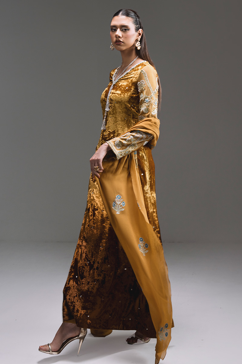 A luxurious V-neck kaftan dress featuring intricate embroidery, hand embellishments, and soft ombré shading for a modern ethereal look. The embellished tassel and scalloped neckline with sequin sprinkles elevate its elegance, while the sleeves showcase detailed motifs. Paired with a chiffon dupatta beautifully adorned with colorful block-printed motifs for a chic, artistic flair.