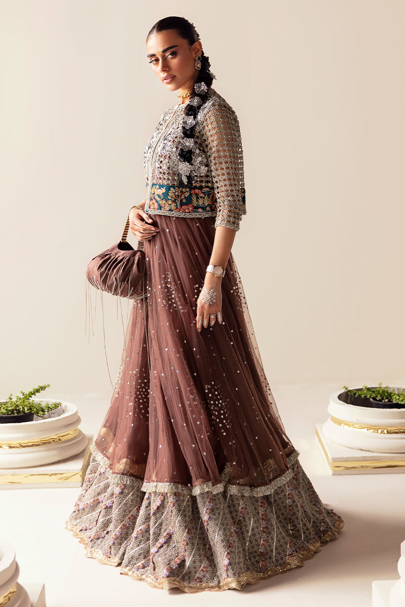 The stunning Nusret ensemble is a dazzling fusion of metallic silver and plum brown. The cropped jacket, Peshwas, and lehnga in this beautiful outfit are all made with the finest craftsmanship and devotion to detail. An abundance of sequins, crystals, and stones are used to create beautiful floral motifs on the front and back of the metallic silver cutwork jacket. It oozes elegance and gives the ensemble a touch of royal splendour with its ornate shikargah border. The Peshwas, which are made of delicate net fabric, are embellished with Swarovski crystals and sequins, giving a stunning look that catches attention from all sides. An embroidered border on the hem of the lehnga, which is made of opulent paper silk fabric. The lehnga's rich flair makes a statement.
