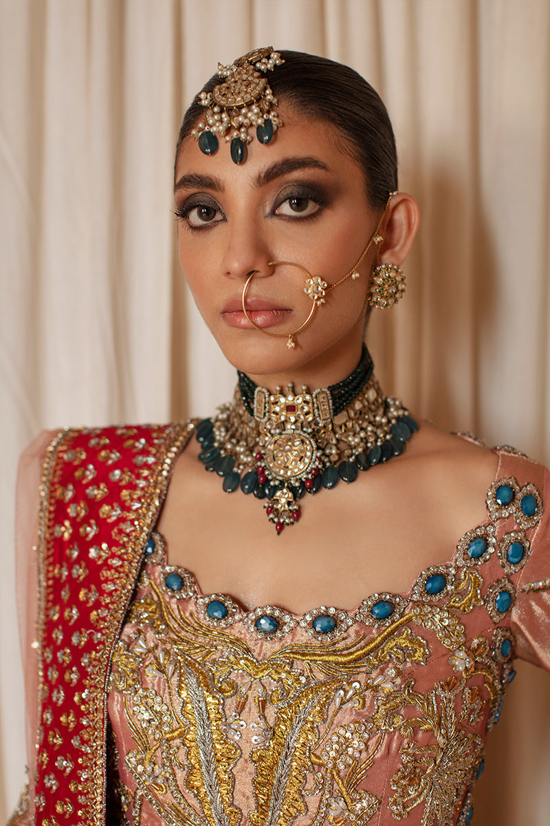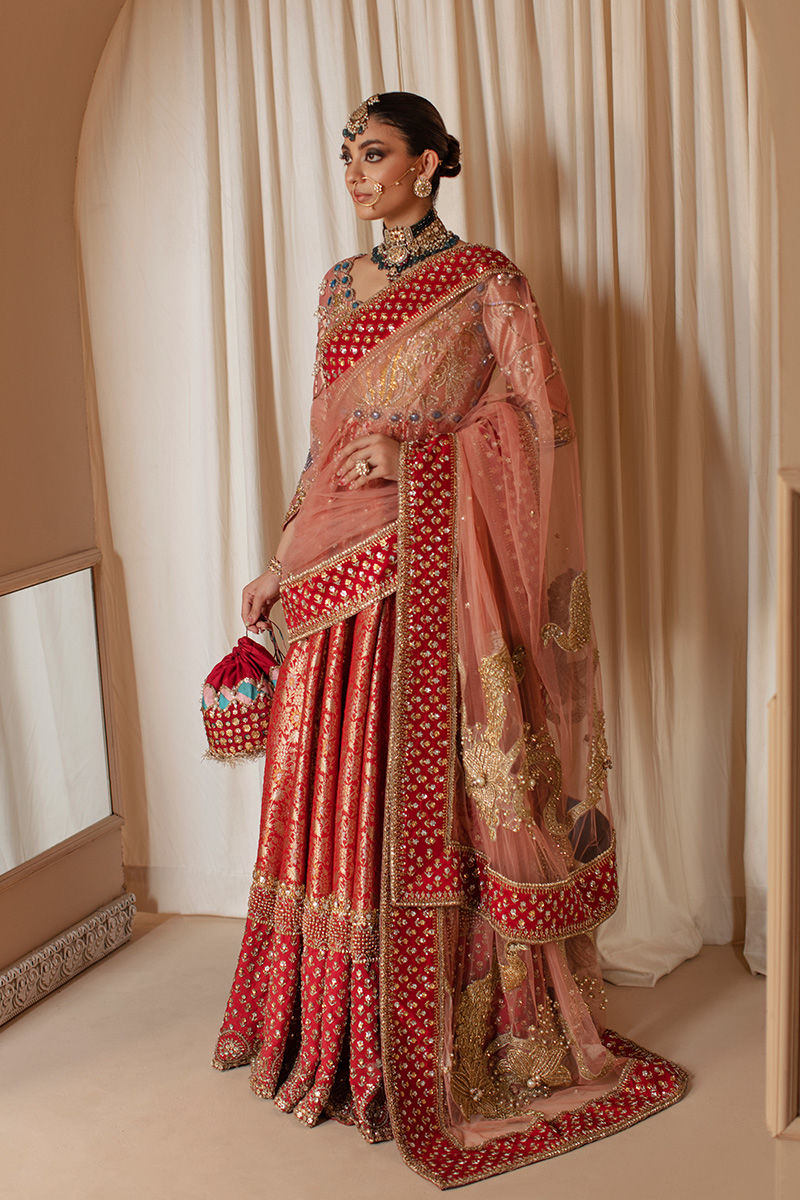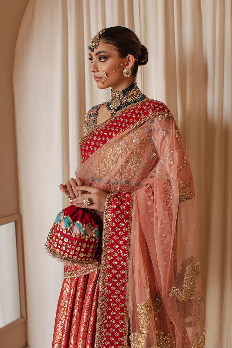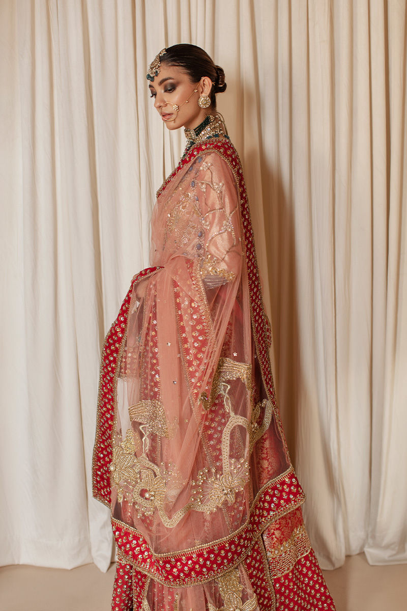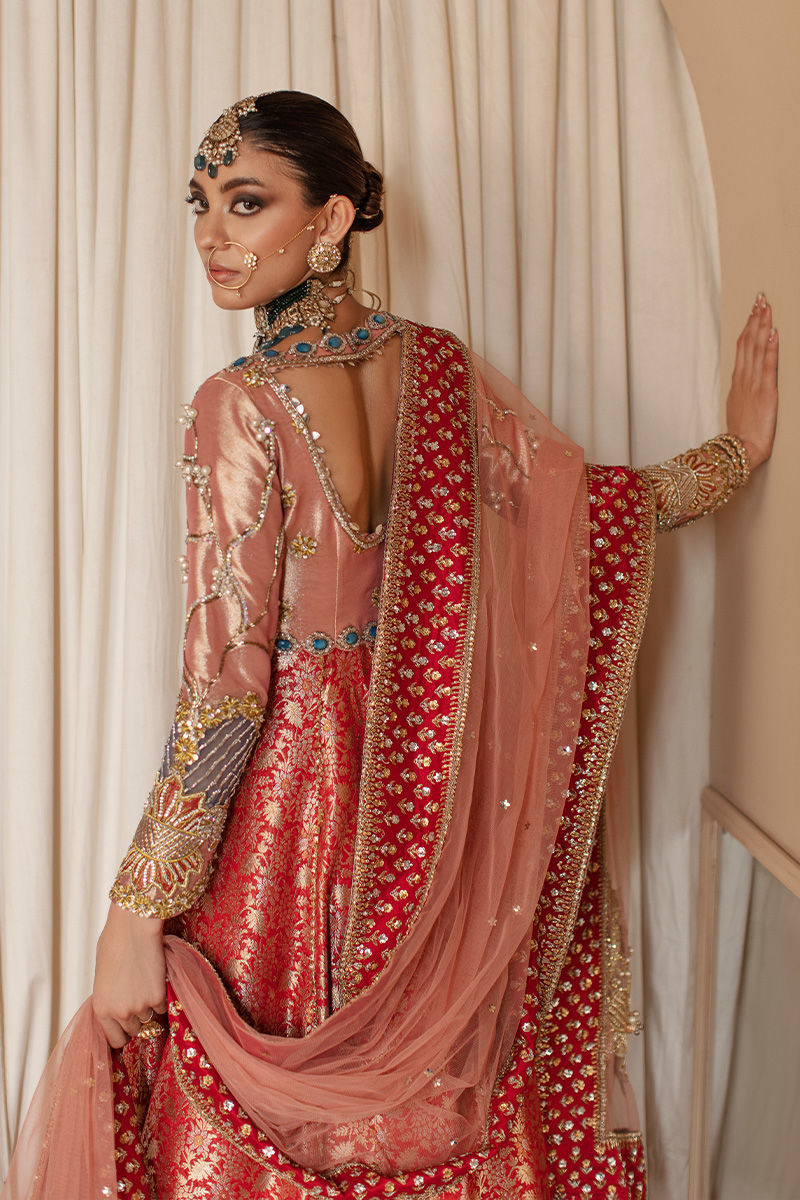 Omaira is a bridal Peshwas gown made in a combination of rose pink and classic red tone depicting love and romance. It is a long body cut Peshwas gown with the blouse and sleeves made in pure tissue fabric in rose pink color with detailed handwork in metallics. The lower part is well executed in pure kimkhaab fabric in red with an ultra-wide border at the bottom. It is a fusion of contemporary and traditional look. Its thoughtfully paired with a net dupatta in rose pink color with wide all four-sided border finely screen printed and hand embellished zardozi work. Palus of the dupatta comprises a very beautiful artistic motifs composition of peacocks and stems with glittering hand embellishment on top.