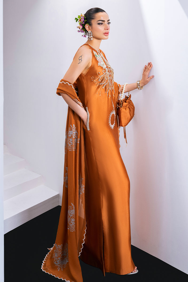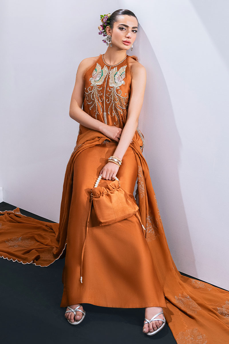A vision in rust. Revel in the intricate hand embellishments of our Halter Neck Kaftan Dress, featuring captivating frayed organza edging and side pockets. The sequin motifs add a mesmerizing sparkle to this ensemble. It is complemented by a Chiffon Block Print Dupatta with scalloped edging that exudes effortless charm.