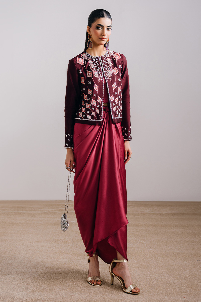 This maroon ensemble features a round-neck, front-open jacket paired with a flowing skirt, creating an elegant and contemporary silhouette. The jacket is adorned with exquisite hand-embroidered and embellished florals, complemented by embroidered and embellished sleeve detailing for a refined finish. It is paired with a flowy wrap-around chiffon skirt, adding graceful movement and completing the look with effortless sophistication.