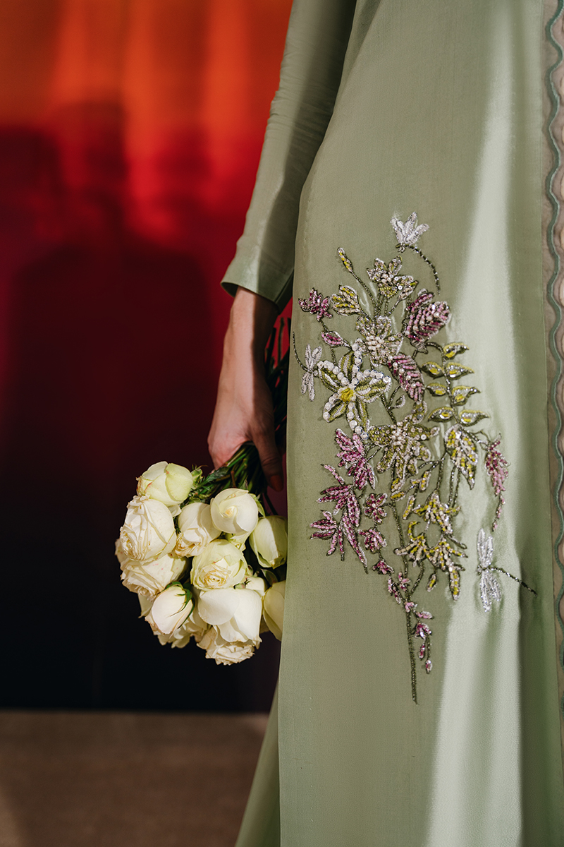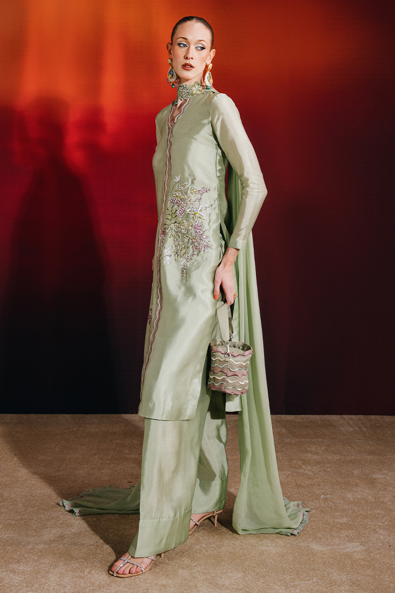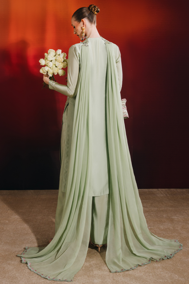 This mint ensemble features a knee-length shirt paired with a farshi shalwar and an embroidered chiffon dupatta, creating a graceful and elevated silhouette. The shirt is adorned with exquisite hand-embellished florals, enhanced with crystals, sequins, and kut dana, and finished with embroidered scalloped borders on the front for added detail. The farshi shalwar adds volume and movement, while the chiffon dupatta, detailed with an embroidered border and pleat accents, completes the look with refined elegance.
