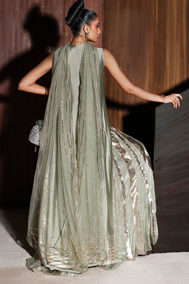 Drape yourself in elegance with this mint masterpiece, adorned with naqshi work, Swarovskis, gota, and sequin detailing. The tissue silk long shirt paired with a shimmer Sharara and a choice of net dupattas offers an exquisite combination of tradition and allure.