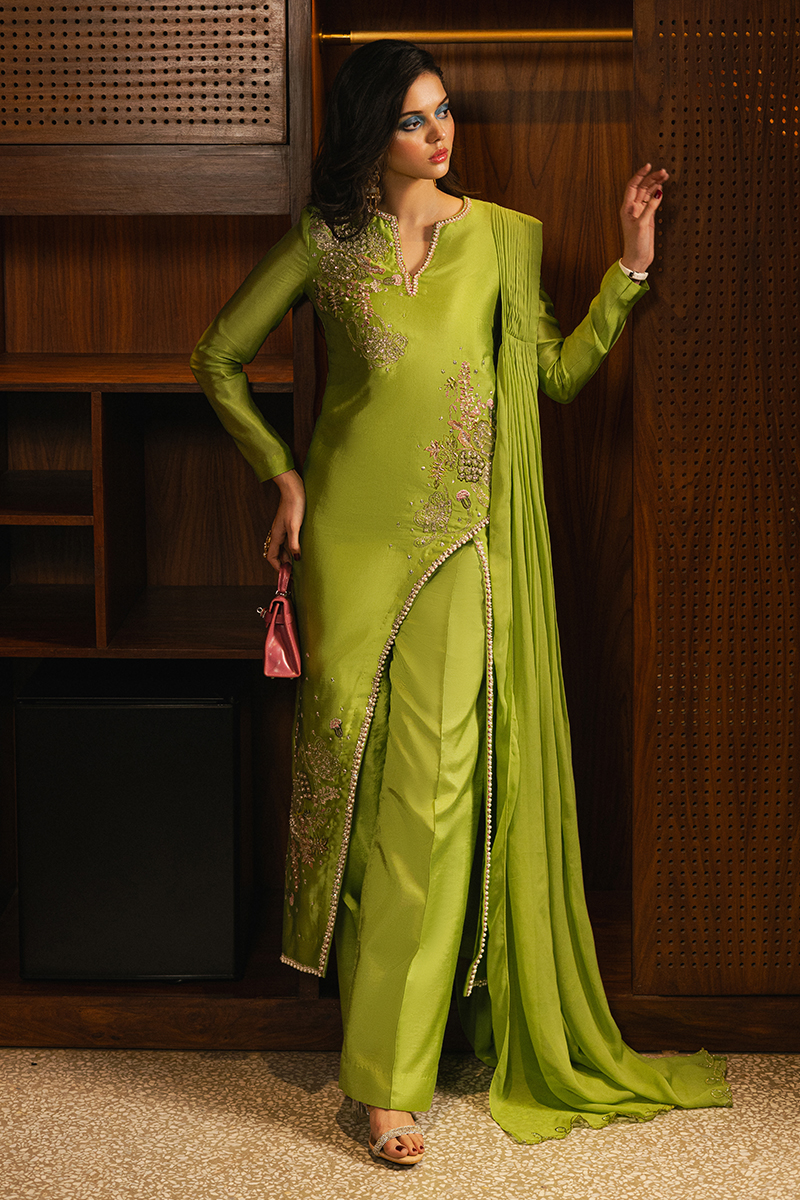 Pop Queen – Where bold elegance meets contemporary finesse. This stunning ensemble features a round-neck asymmetrical shirt, adorned with exquisitely embroidered floral bunches and chunky embellished borders for a striking yet refined look. The straight-fit trouser complements the silhouette perfectly, while the pleated chiffon dupatta, elevated with an embroidered scallop border, adds a touch of graceful movement. Pop Queen is a statement of modern sophistication, perfect for those who dare to shine effortlessly.