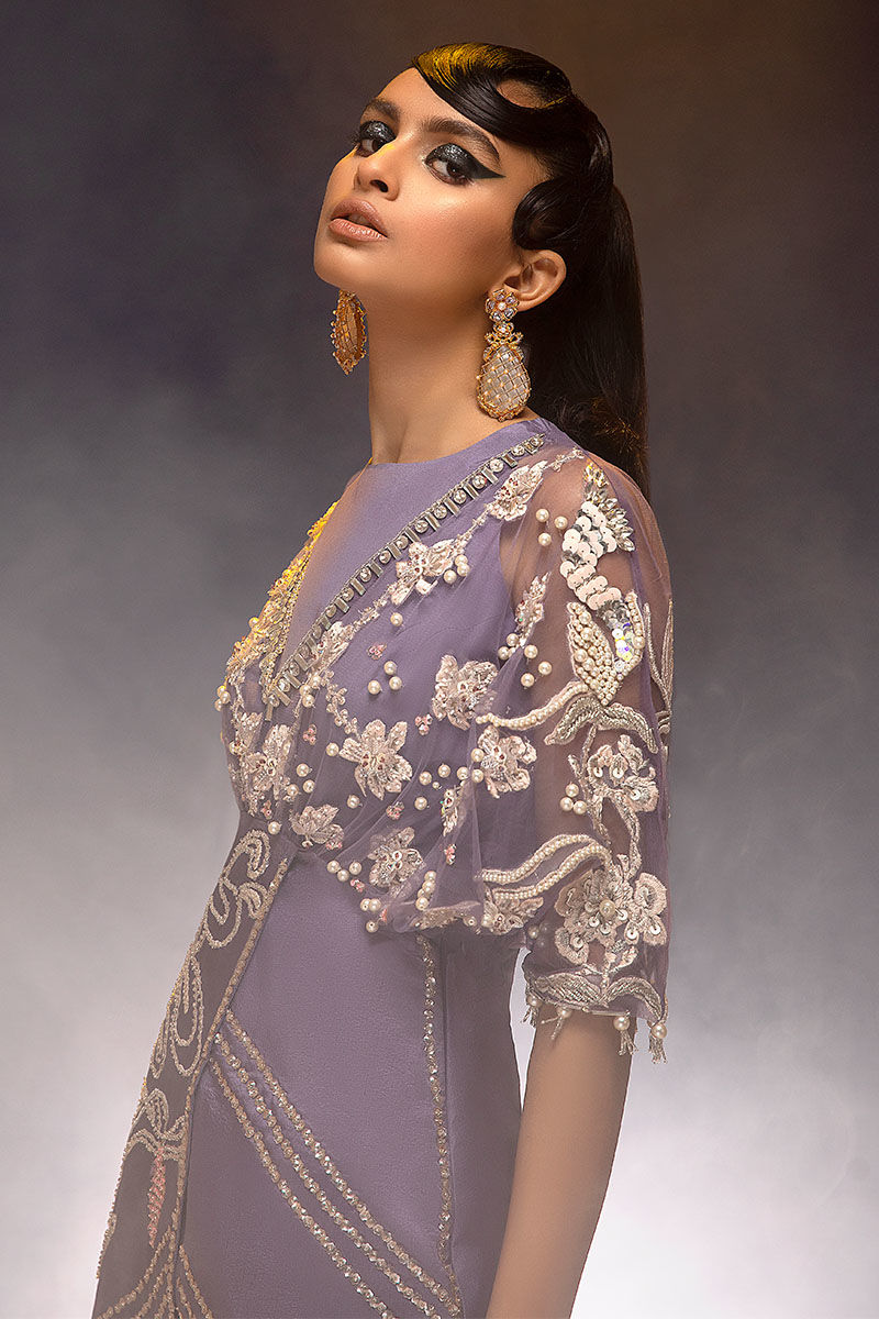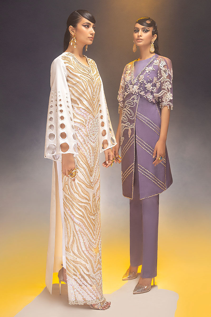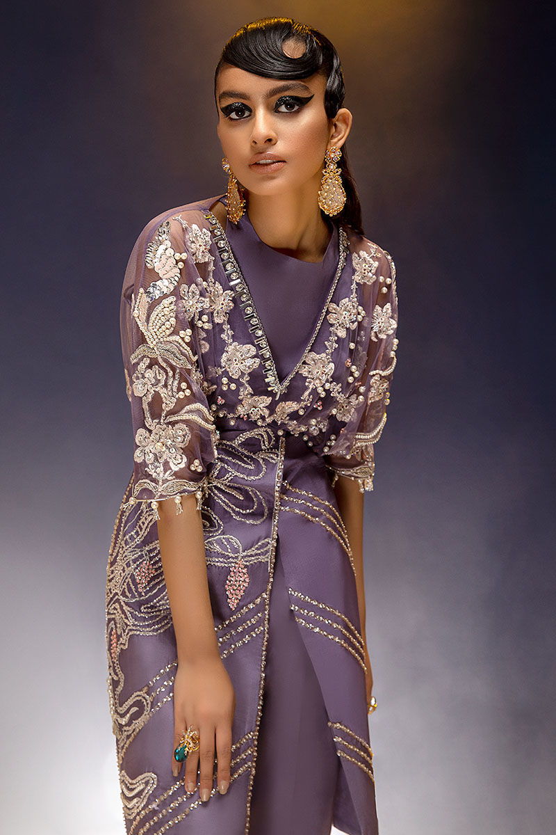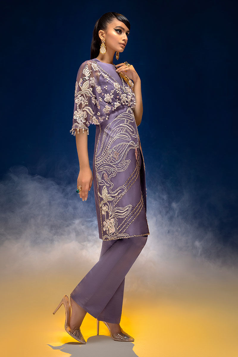 Waist cut kimono top with straight pant. Floral embroidery with beautiful 3d hand embellishment with shiny tassels on sleeves.