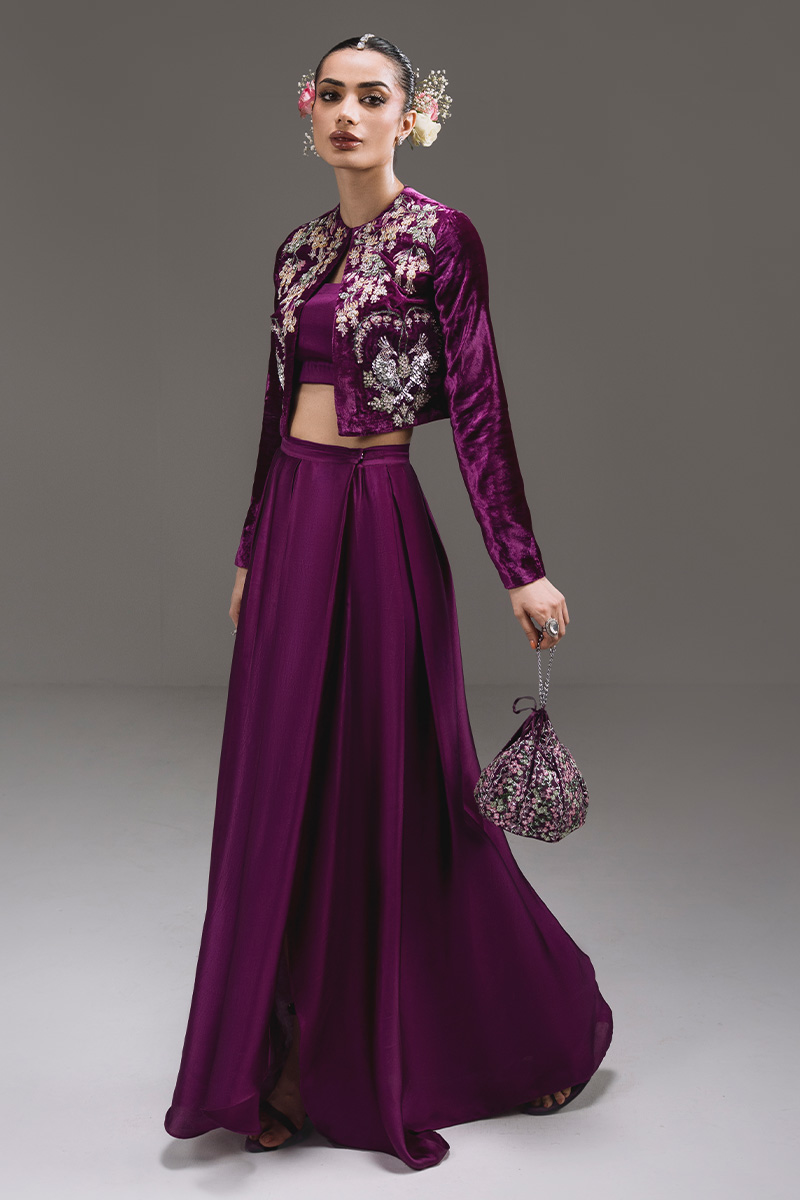 A chic round-neck, front-open jacket adorned with delicate embroidery and embellishments, radiating modern elegance. Paired with a soft, box-pleated skirt that drapes beautifully, this ensemble blends structure with graceful movement. A sophisticated look perfect for contemporary festive charm.