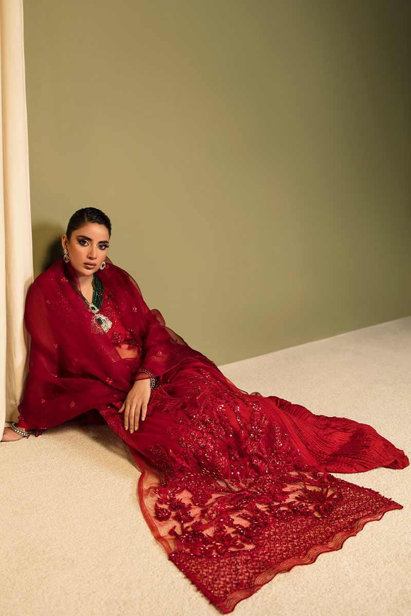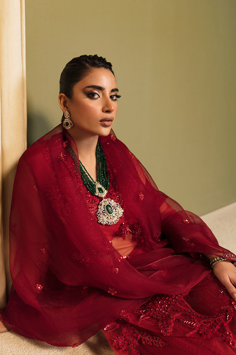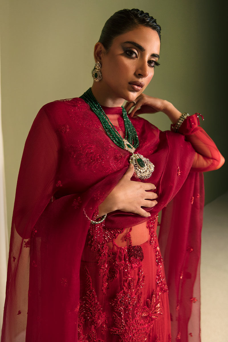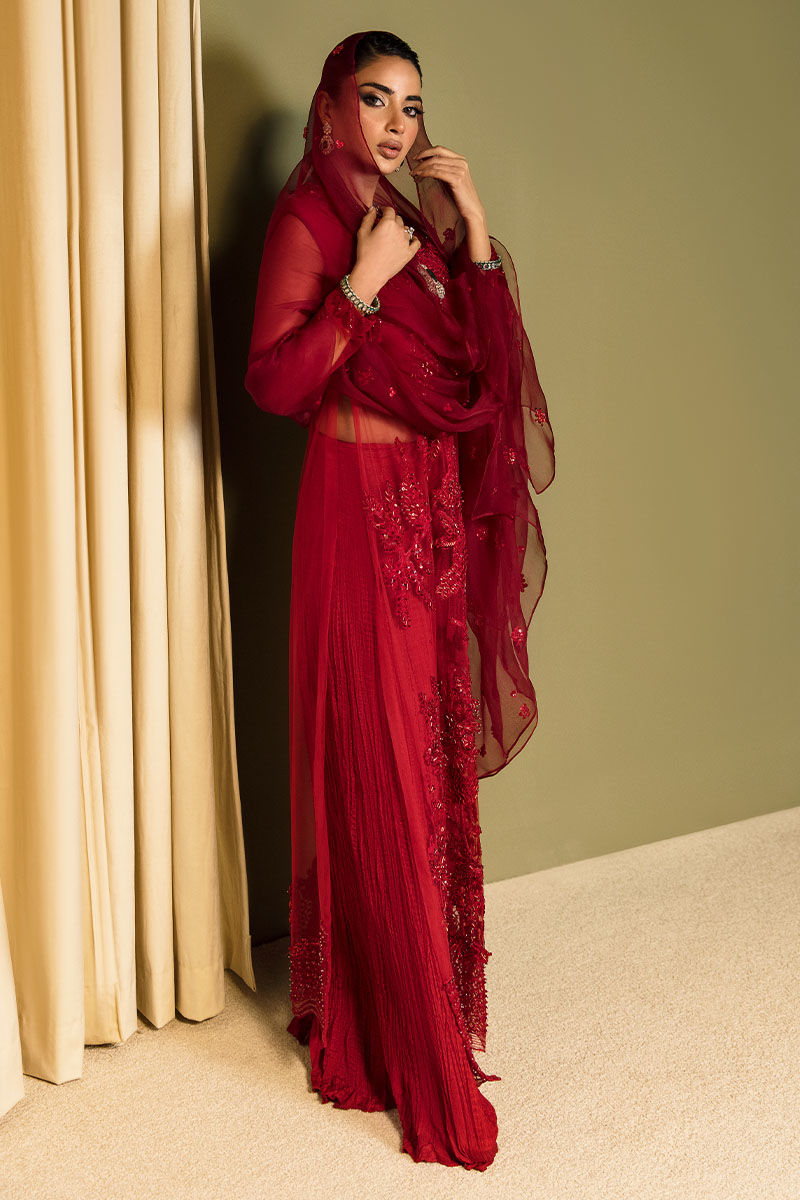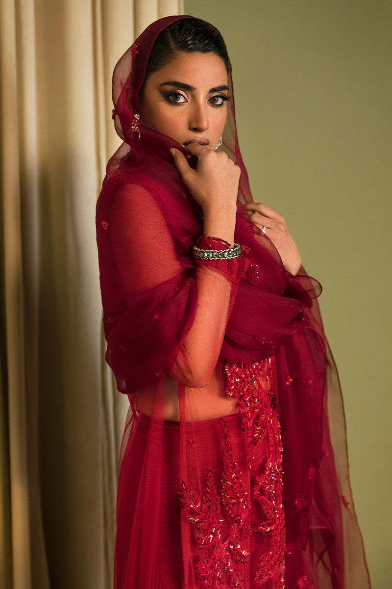 Red communicates feelings of passion. Raat ki Rani is a long red body cut shirt in net fabric With sleeves in net as well. The shirt has unique red-on-red embellishment with exclusive stones and high-end material. It has a very classic shine. Raat ki Rani comes with an organza dupatta with hand-embellished boti spray on it in red.