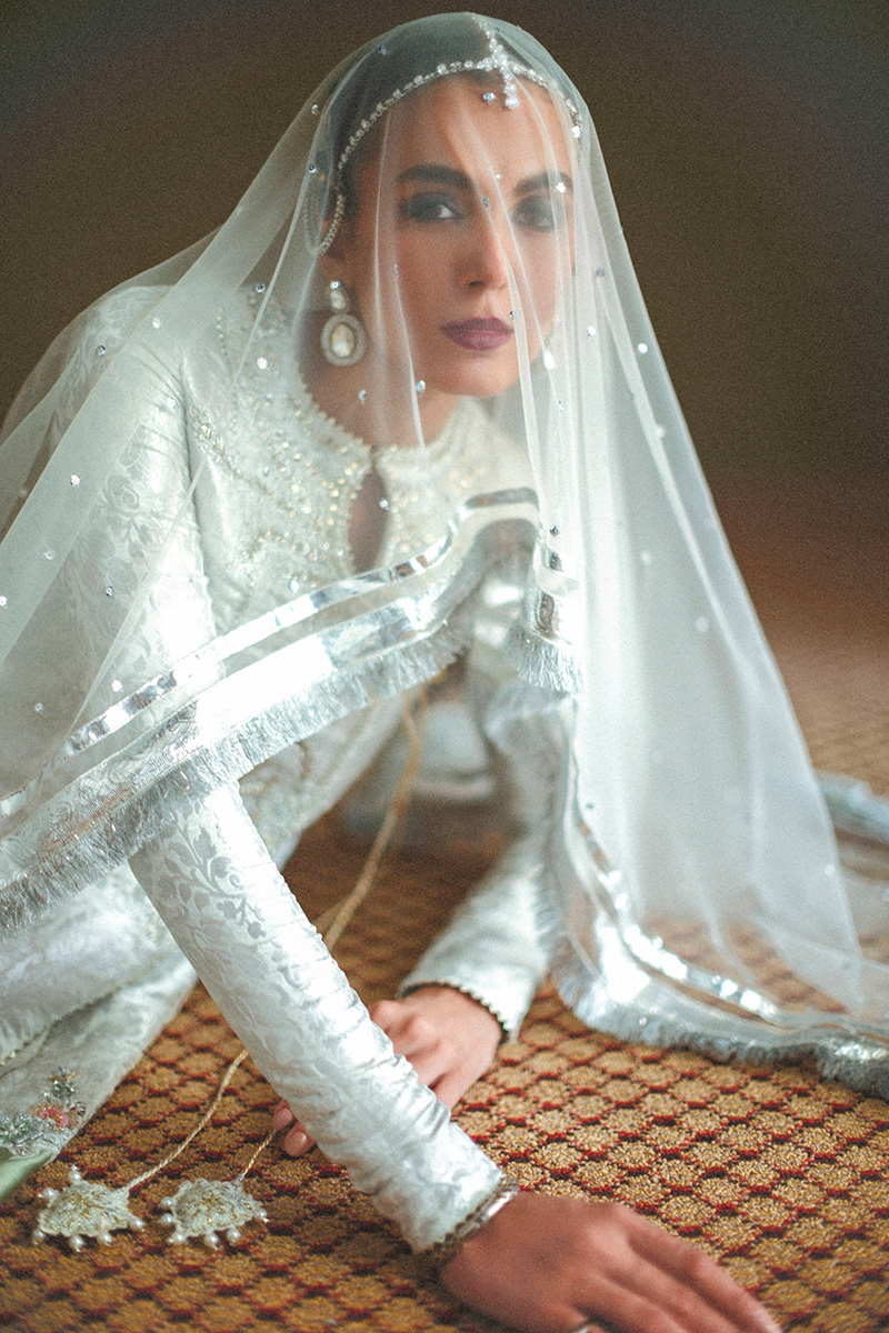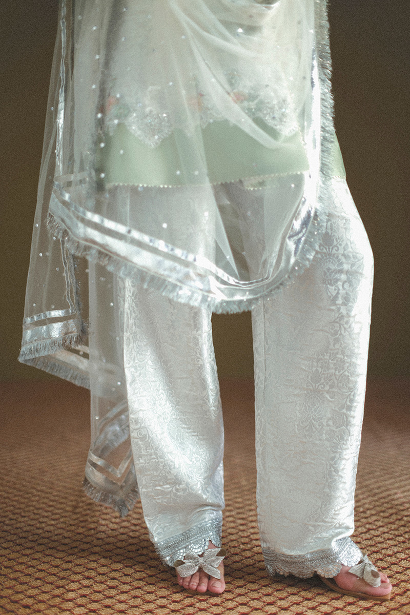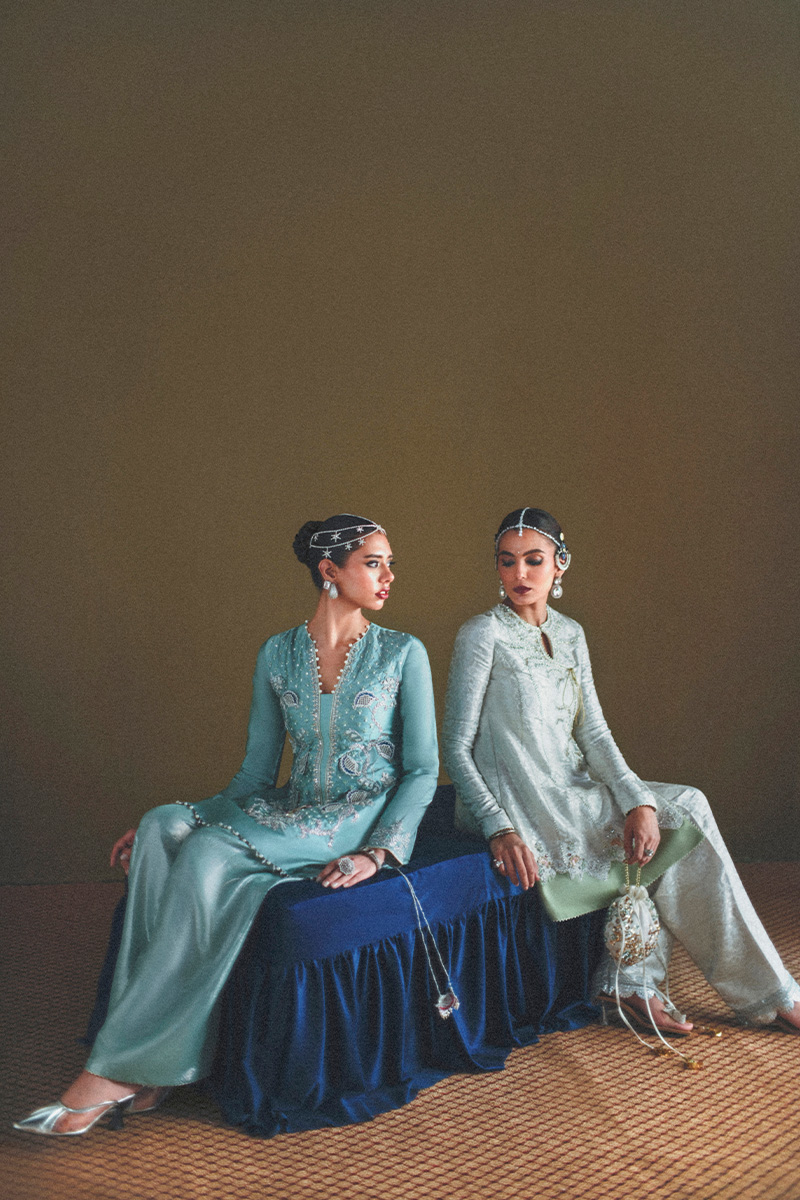 Rano - This exquisite ensemble features an intricately embroidered and embellished Angrakha cut peplum, adorned with intricate dabka, nakshi work, sequins, pearls, and crystals, each element thoughtfully placed to evoke timeless charm. The back boasts a delicately embroidered motif, while tassel accents and contrast patching elevate the artistry of the piece. Paired with a classic shalwar detailed with a finely embroidered border and a flowing organza dupatta finished with sequin spray, lappa trim, and traditional Kiran lace, this outfit blends heritage with festive finesse, making it perfect for your most special occasions.