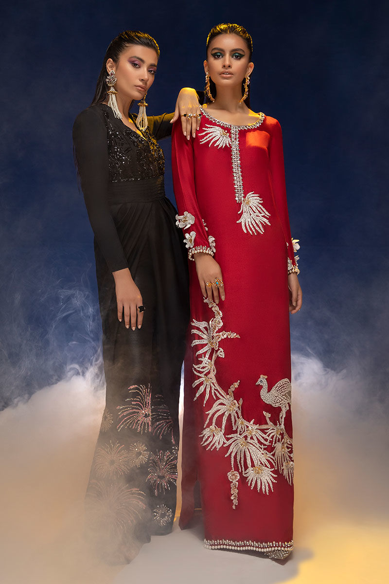 Floor length cherry red raw silk shirt with side slits. Extravagantly plumed peacock on a tree made in white thread with hand work enhancements mixed with Swarovski beaded neck and hem.