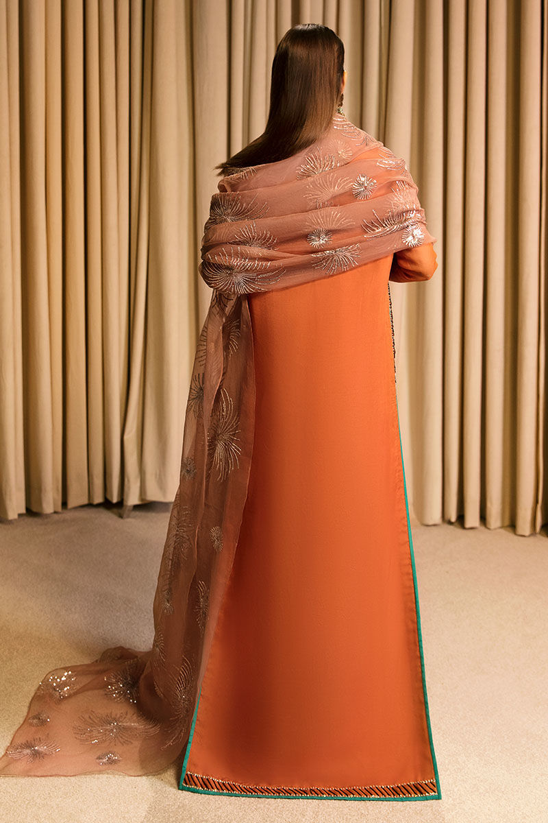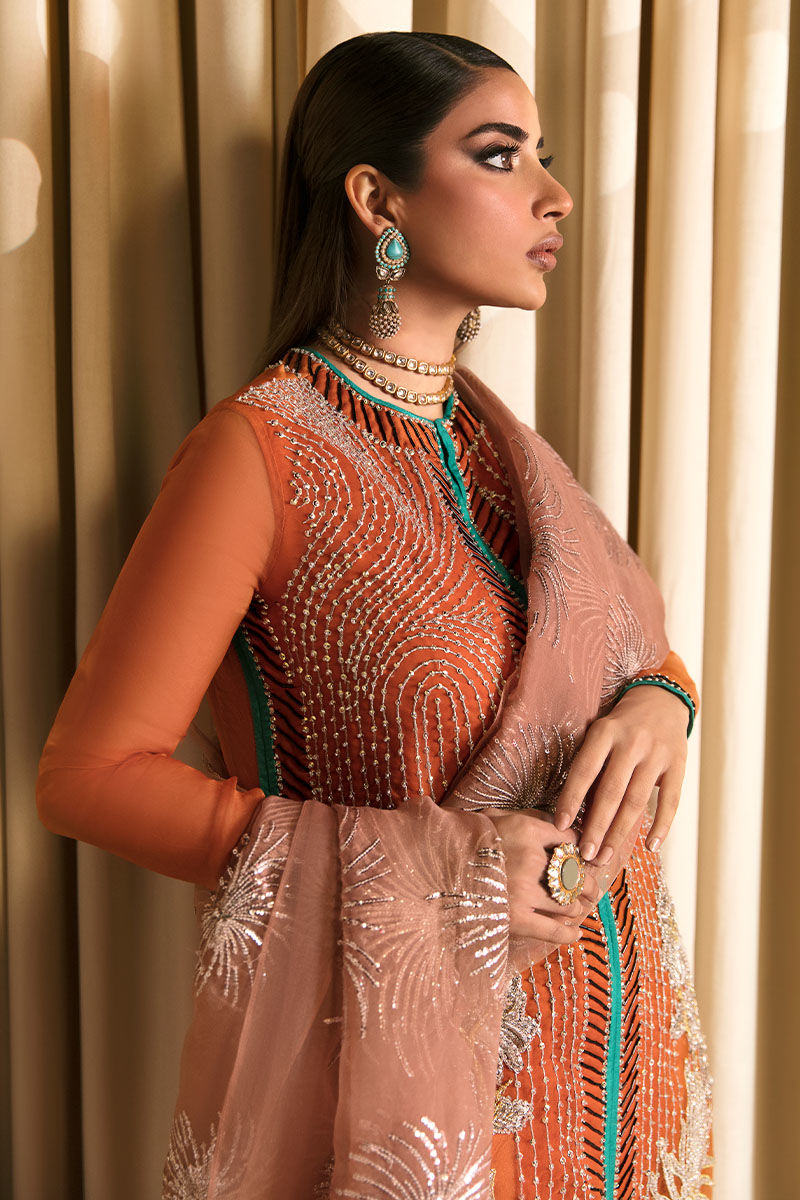 Champa is an attire with elegance. It features an organza long shirt with slits on the sides and front as well. A beautifully crafted attire with magnificent floral motifs combined with linear elements makes this outfit admirable. It has a contrasting combination of Ferozi accent tone with dull orange and a complete black edging. Having straight palazzo pants in pure thai silk fabric with an organza dupatta with sequins embellished fireworks on it.