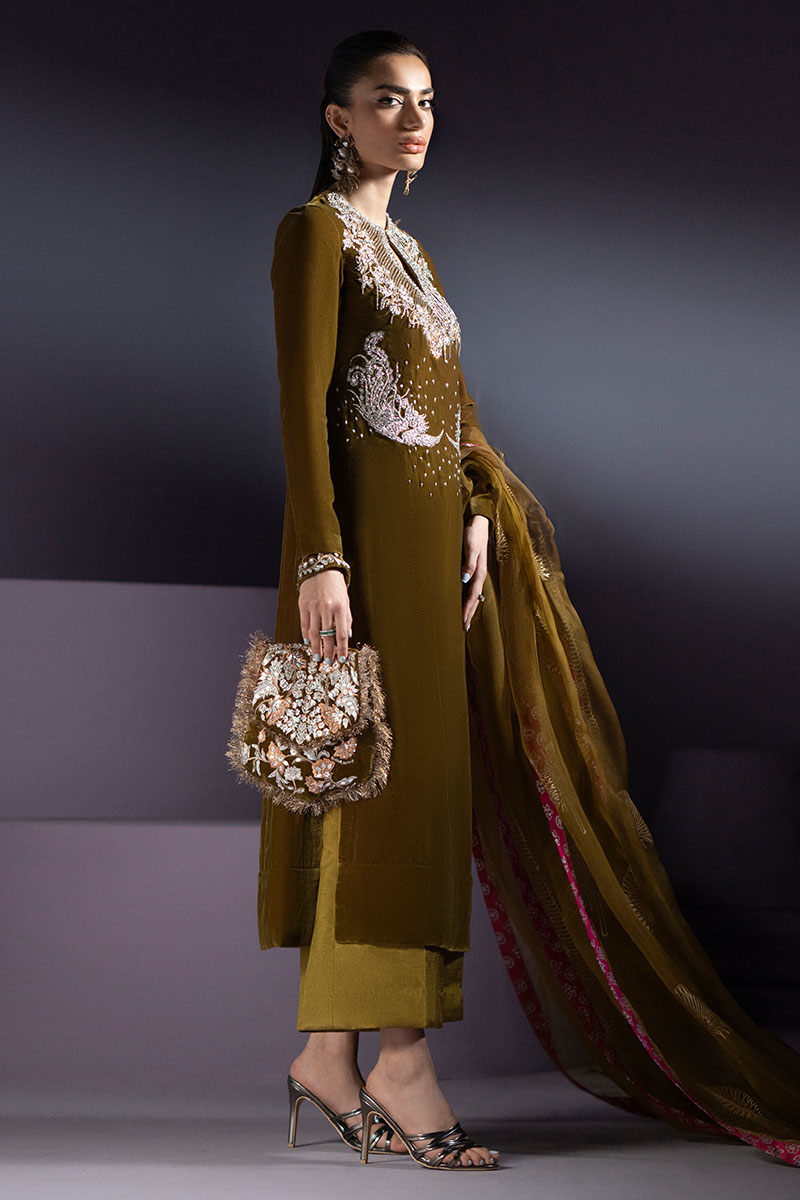 Dress to impress in ‘ROCCOCO’ a sumptuous pea green velvet ensemble, adorned with exquisite silver embellishments that grace the entire neckline. The unique floral embellishment around the neckline adds an extra touch of sophistication. Paired with an organza dupatta featuring contrasting pink edging on the pallus. This ensemble is destined to stand out at any event. Elevate the glamour with an embellished bag, and complete the look with luxurious Thai Silk trousers, ensuring a captivating and cohesive style statement.