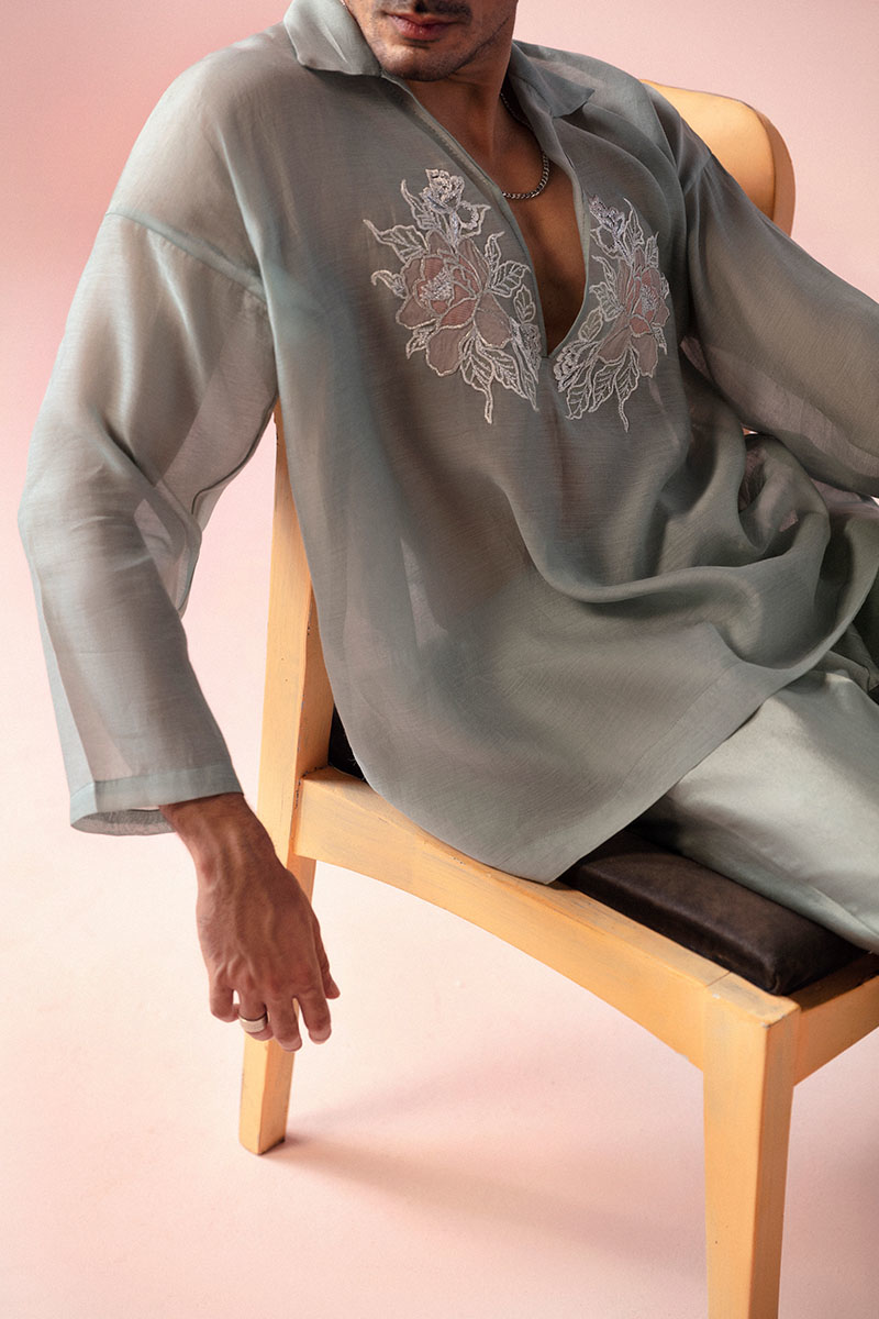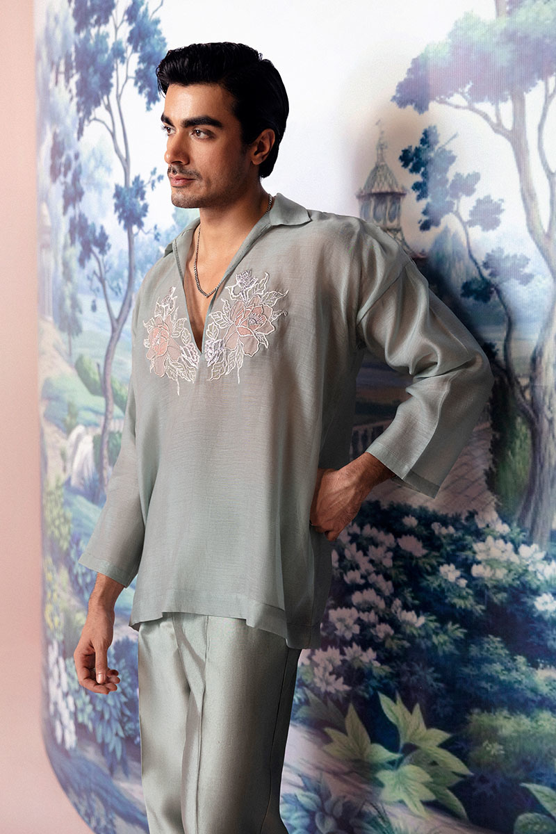 Includes: Shirt, Trouser A charming dull sage green outfit. The paper silk shirt boasts a deep V-neck with collar detail and exquisite patchwork, while the relaxed fit trouser ensures comfort making it an embodiment of sheer elegance and style.