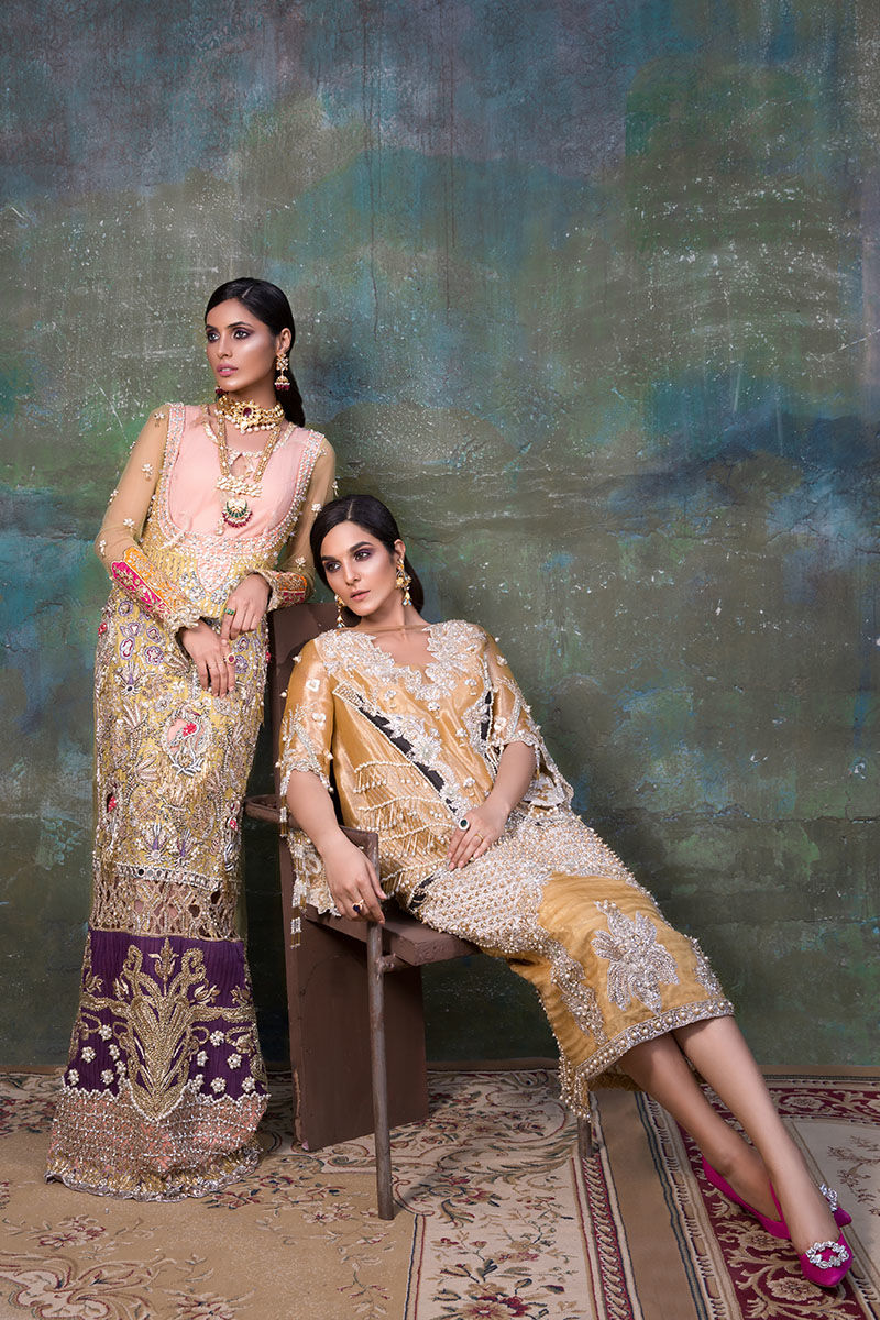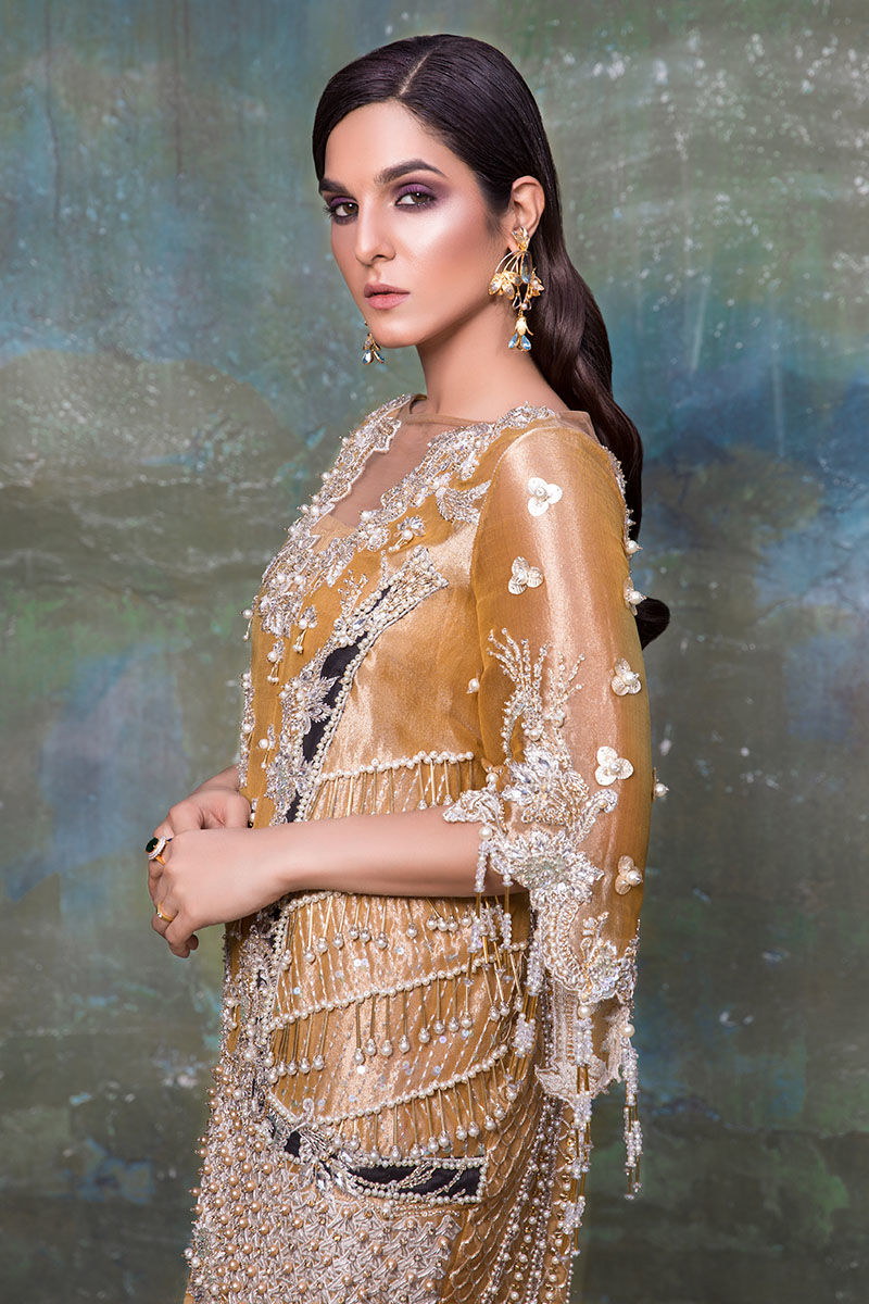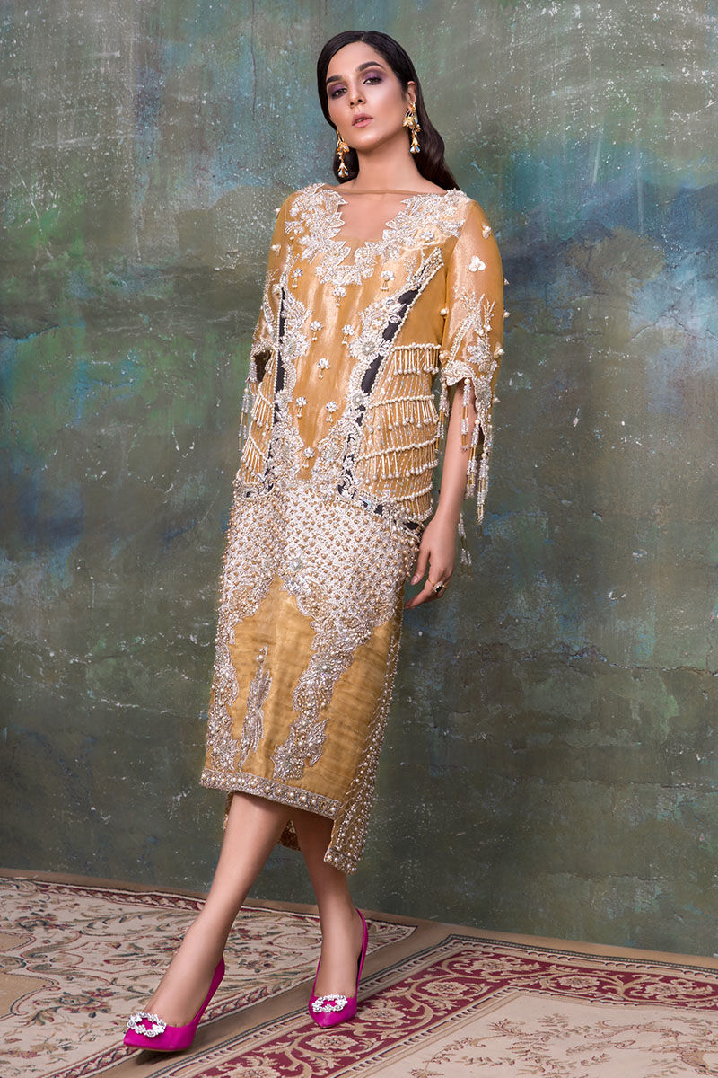 Baggy cut trendy formal shirt with a mix of hand and machine embroidery, with tints of black. Heavy use of tassels in silver has been used. Plain raw silk pants can be added on demand and organza/chiffon dupatta with spray can be added on demand.