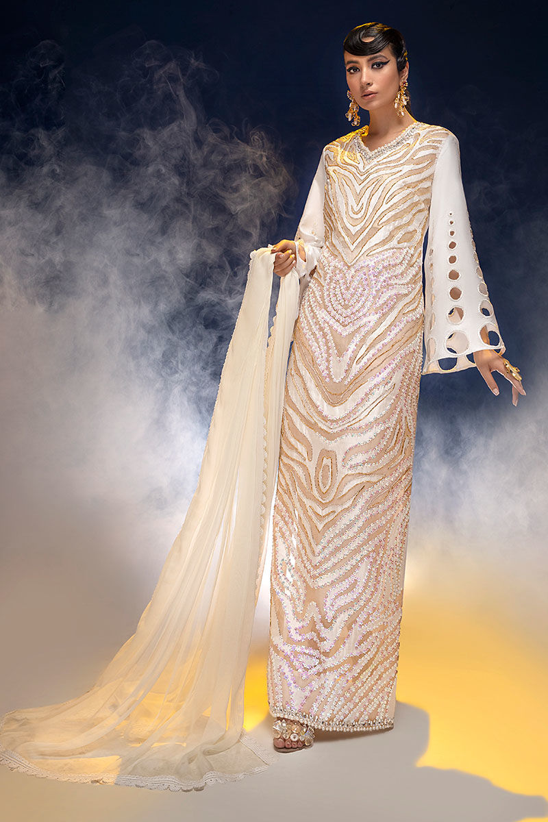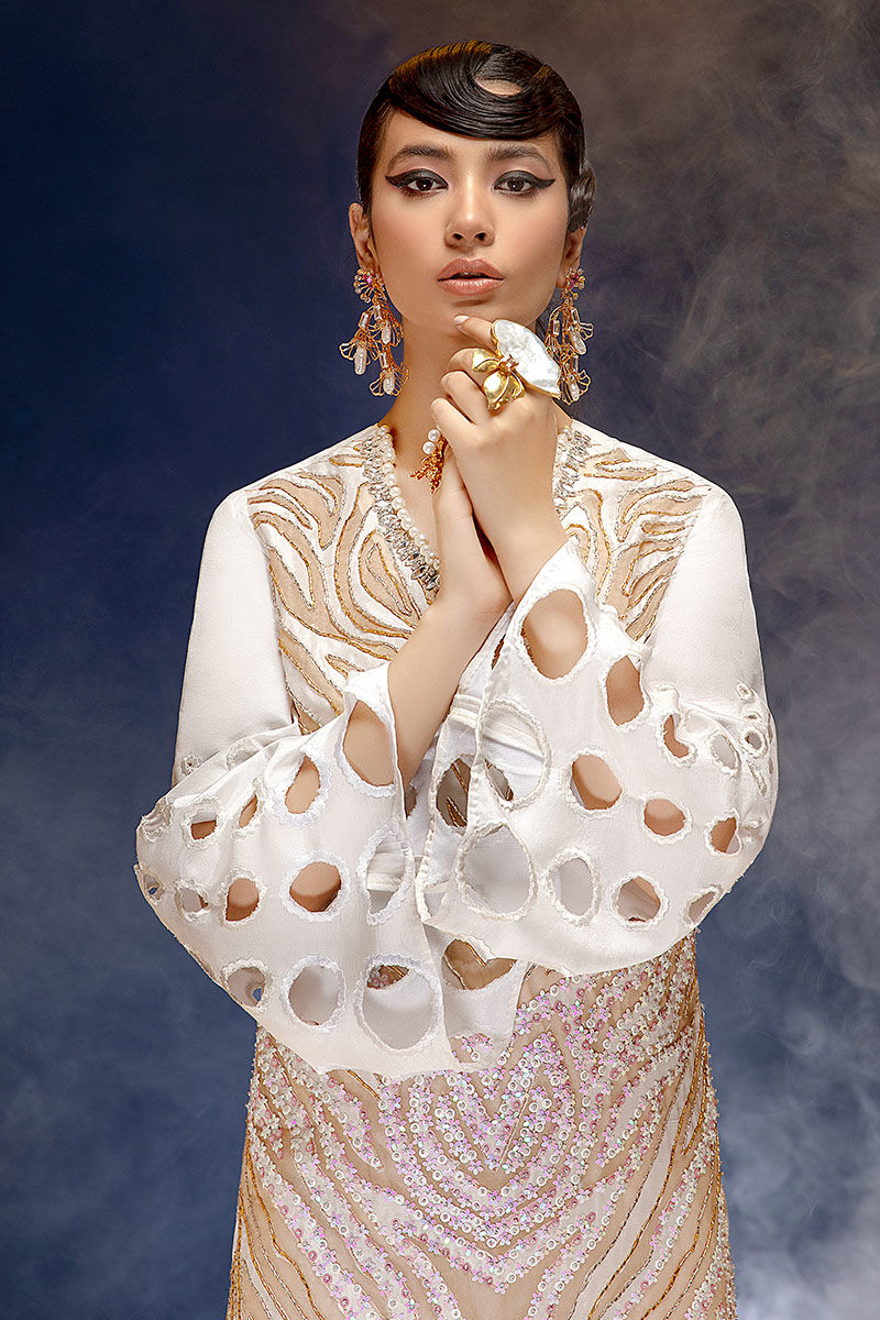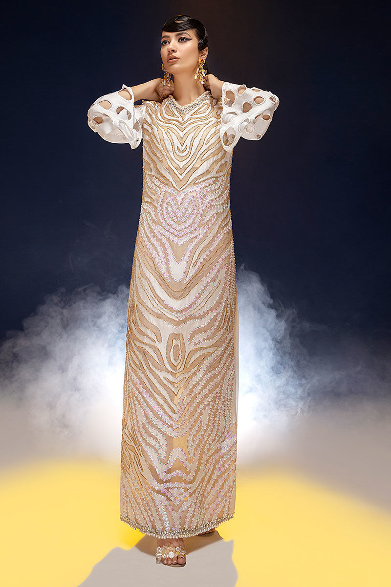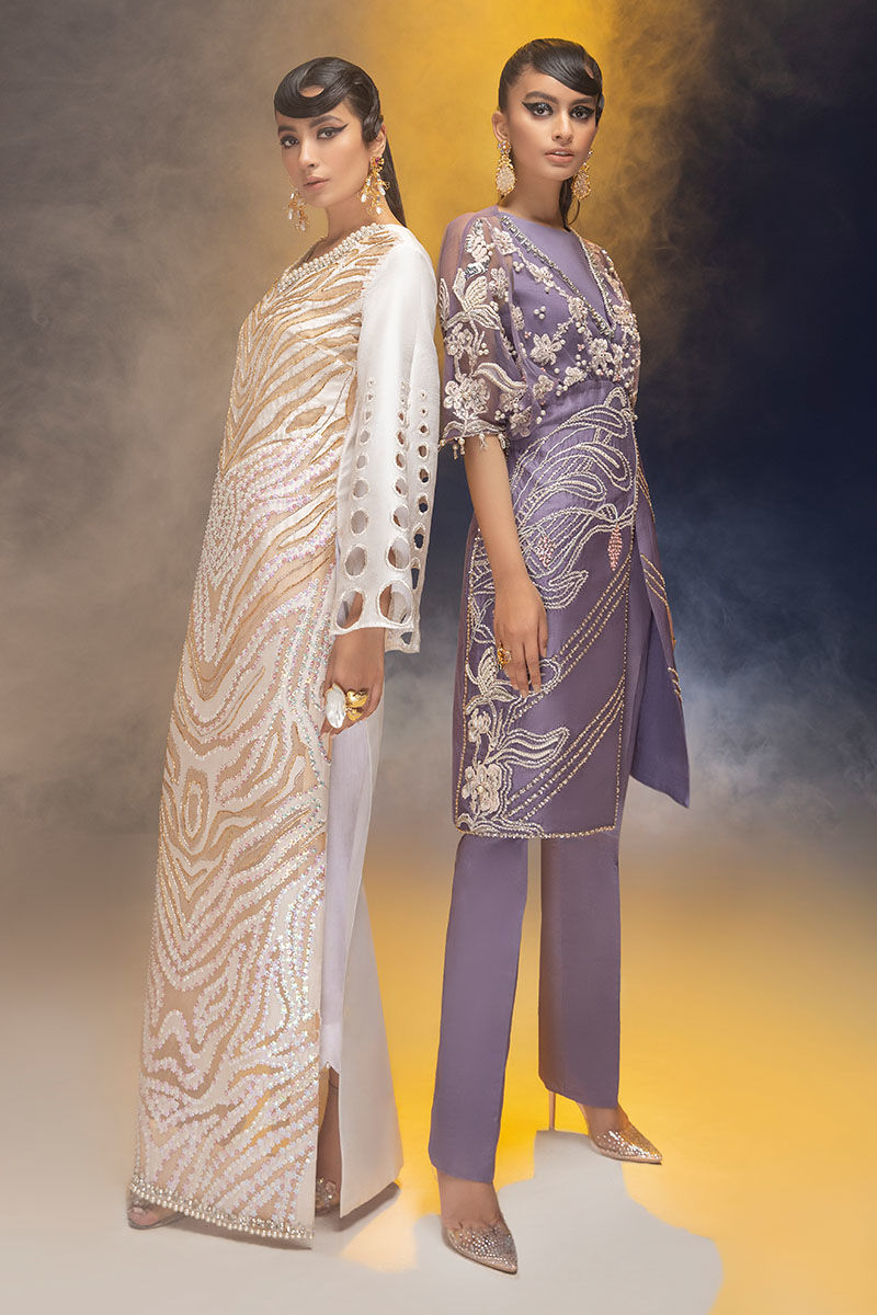 Long slits waist fitted shirt with A-line sleeves and cigarette pant. Zebra print hand flower sequence embellishment.