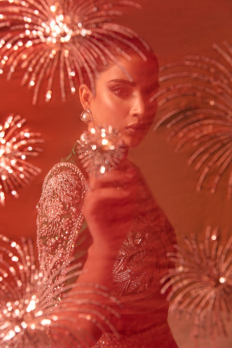 Lehenga has a hand-embellished border at the bottom. Shezadi comes with an organza dupatta in red with full sequins embellished.