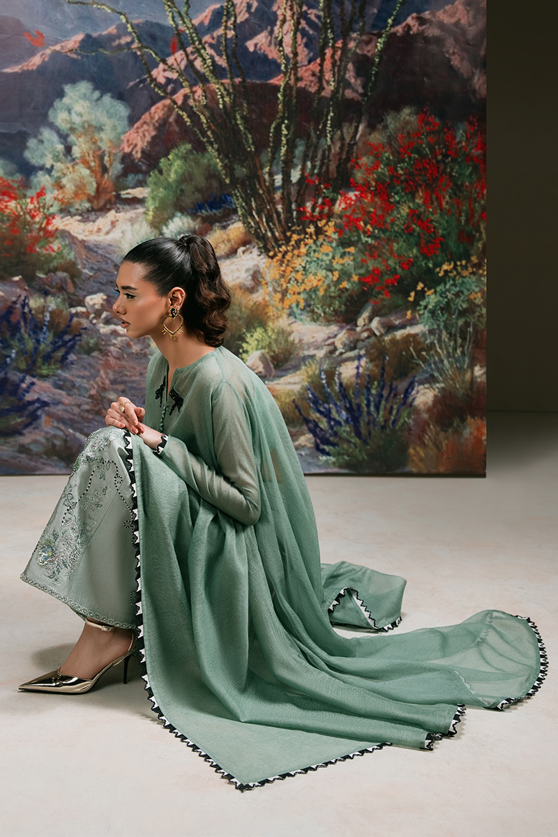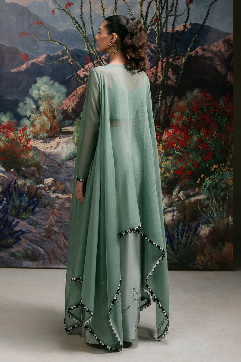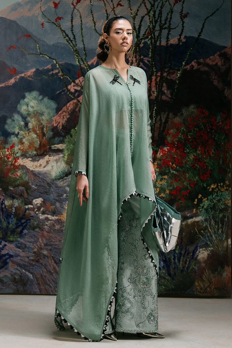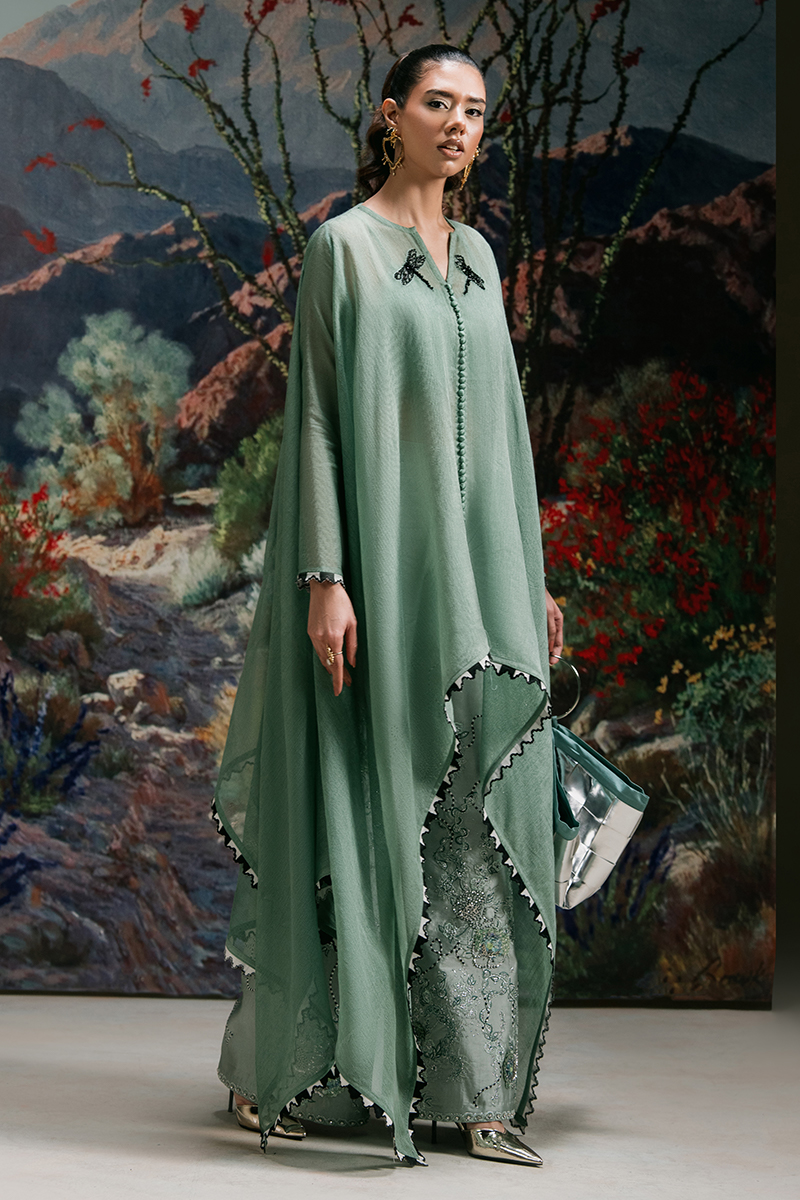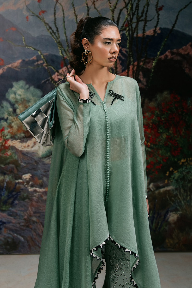 Starstruck - A Vision of Effortless Elegance. Drape yourself in the allure of Jade Green with Starstruck, a masterpiece of refined craftsmanship. This cotton net kaftan, adorned with a delicately embellished dragonfly motif, exudes effortless charm. The design is elevated with a scalloped embroidered border and intricate button detailing on the front, adding a touch of sophistication. Paired with a straight-fit Thai silk trouser, exquisitely embroidered and hand-embellished with cut dana, crystals, pearls, and sequins, this ensemble is a statement of modern elegance and timeless beauty.