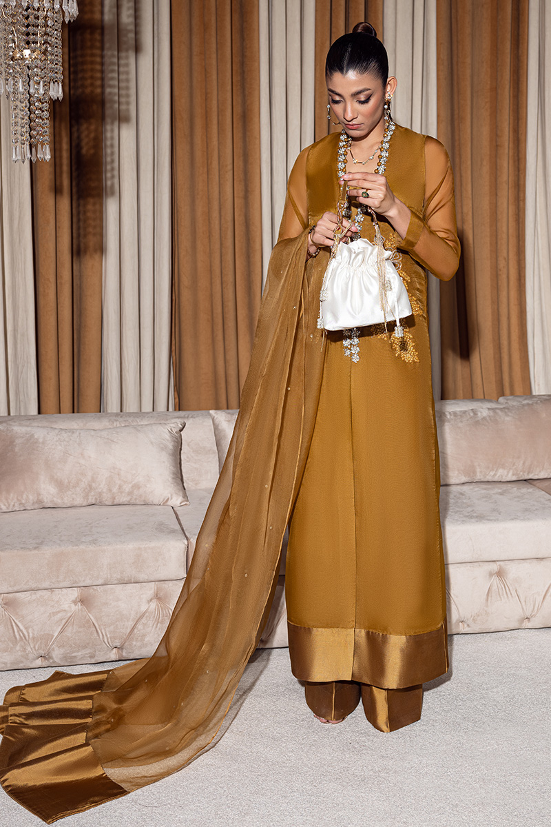 Swanky features a timeless curation on this long mustard organza shirt adorned with heavy embroidery and hand embellishments on a beautiful bodice. The ethereal organza dupatta is layered with splendid work and silk border finishings. Paired along are straight bootcut pants for a traditional attire. A traditional essence into this modern silhouette. The shirt has a mid-slit with silk edgeing.