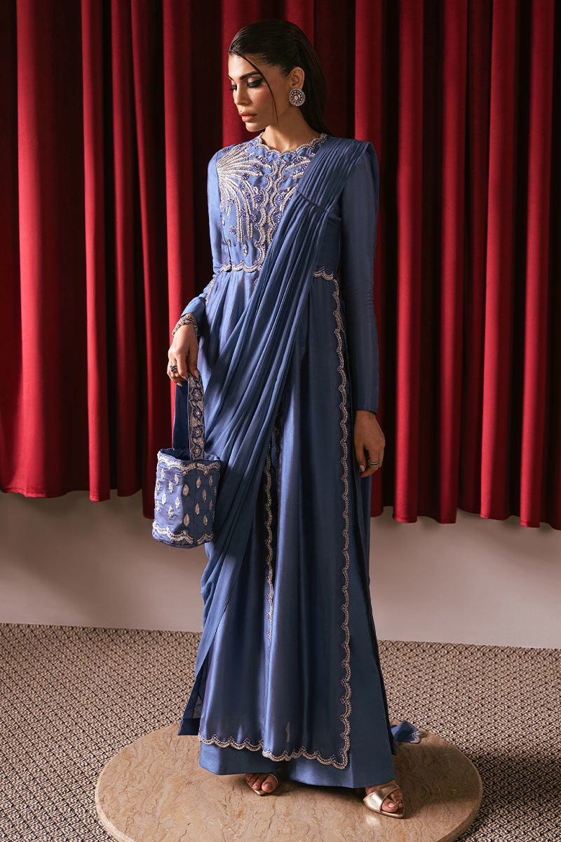 Indulge in sophistication with the captivating "Urban Femme" ensemble, resplendent in its timeless blue hue. The contemporary shirt, meticulously crafted from luxurious tissue silk, features an intricately embellished bodice and delicate scalloped slits, seamlessly blending modern design with timeless allure. Paired with a sleek bootcut trouser in sumptuous Thai silk, this ensemble epitomizes effortless style. Complemented by a pleated chiffon dupatta and an embellished bag. Radiating confidence and refinement, Urban Femme stands as a symbol of the modern woman's unparalleled elegance and sophistication.