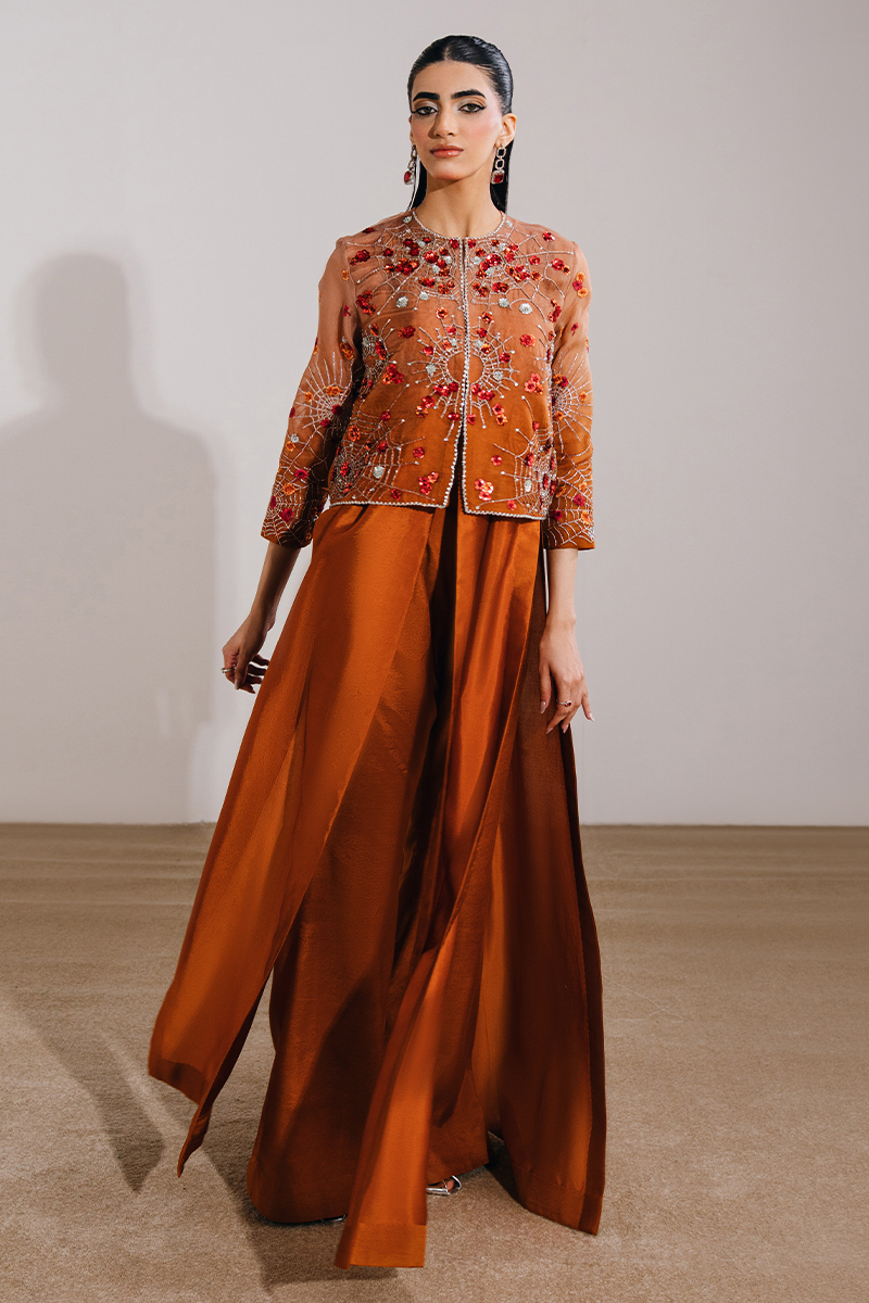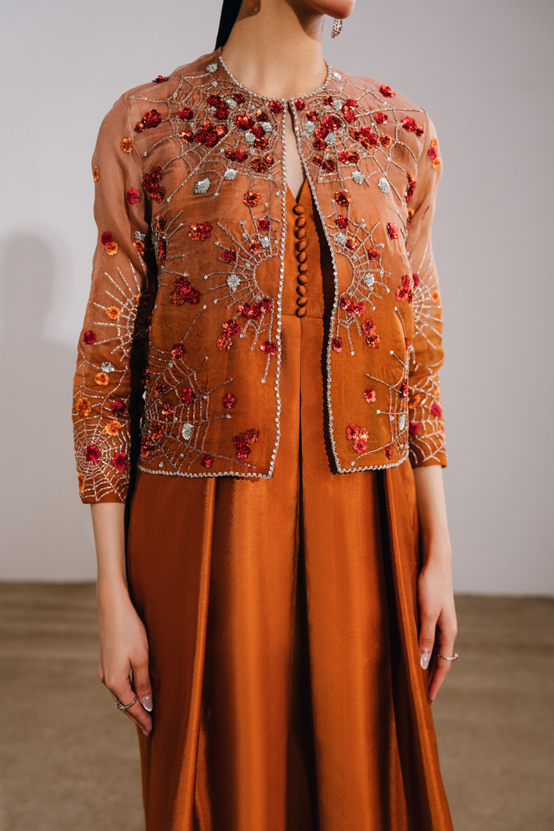 This burnt orange ensemble features a front-open short jacket paired with a layered dress and boot-cut pants for a modern, statement silhouette. The jacket is adorned with exquisite hand-embellished motifs and borders, complemented by meticulously embroidered sleeves for added detail. The underdress is designed with a sleeveless short bodice, attached with fluid panels and accentuated by waist-high slits that add movement and edge, while the boot-cut trousers complete the look with a refined, contemporary finish.