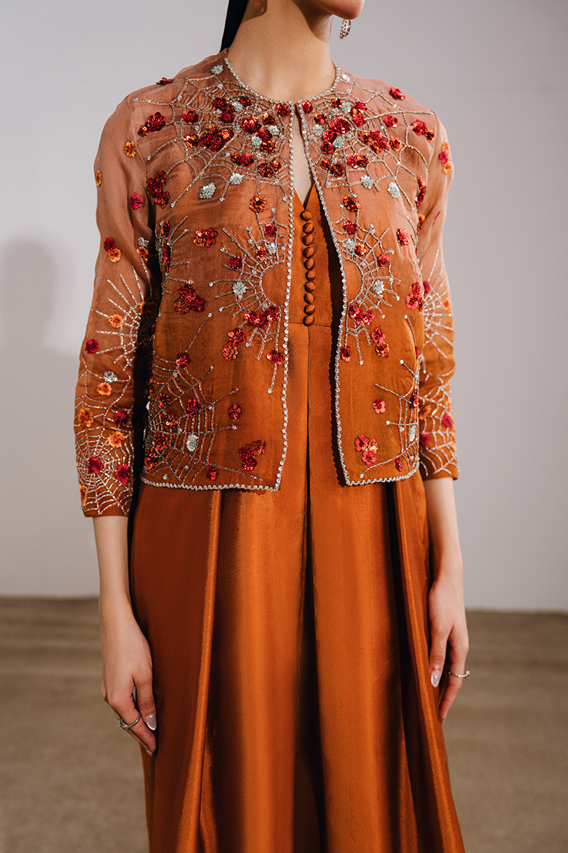 This burnt orange ensemble features a front-open short jacket paired with a layered dress and boot-cut pants for a modern, statement silhouette. The jacket is adorned with exquisite hand-embellished motifs and borders, complemented by meticulously embroidered sleeves for added detail. The underdress is designed with a sleeveless short bodice, attached with fluid panels and accentuated by waist-high slits that add movement and edge, while the boot-cut trousers complete the look with a refined, contemporary finish.
