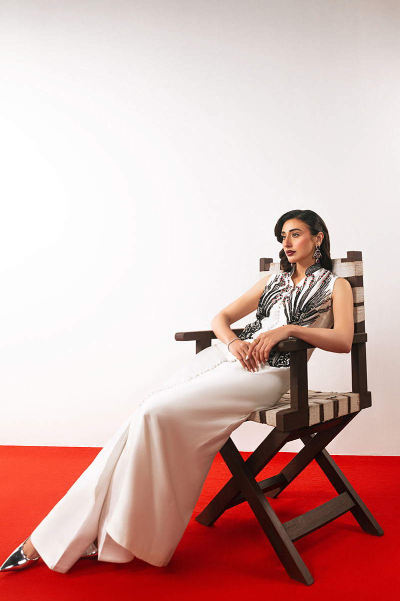 Indulge in elegance with our "White Hawk" ensemble, a fusion of modern sophistication and timeless charm. Crafted from luxurious Tissue Silk and Thai Silk, this ensemble exudes refinement and grace. The sleeveless shirt boasts intricate front button detailing and is adorned with a meticulously hand-embellished motif, showcasing exquisite craftsmanship. Paired with flattering boot-cut pants, this ensemble offers a silhouette that flatters every figure. Adding a touch of allure is the stunning tie and dyed dupatta in organza, featuring a mesmerizing interplay of black and white hues. With its draped lower part, the White Hawk ensemble is a symbol of regal charm and effortless style, perfect for special occasions.