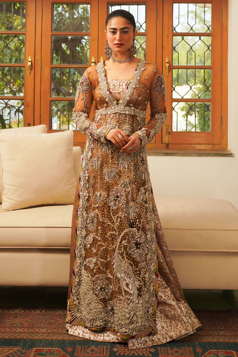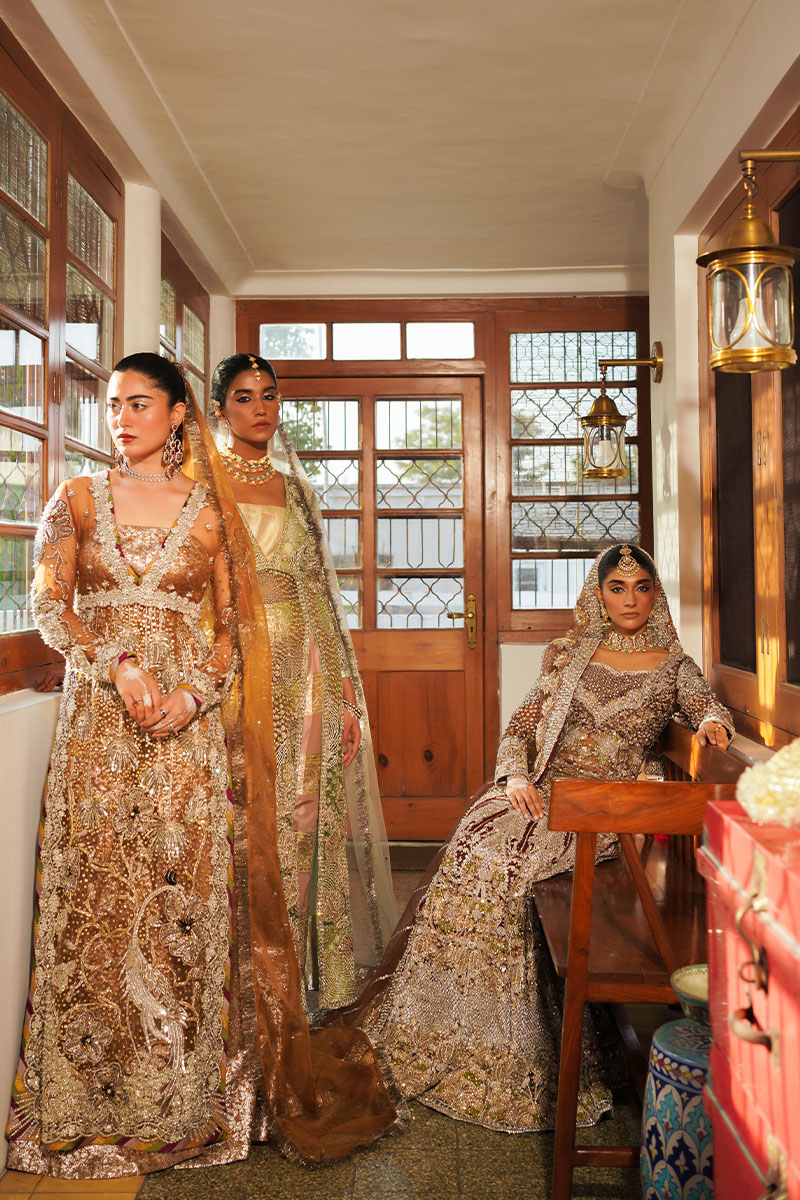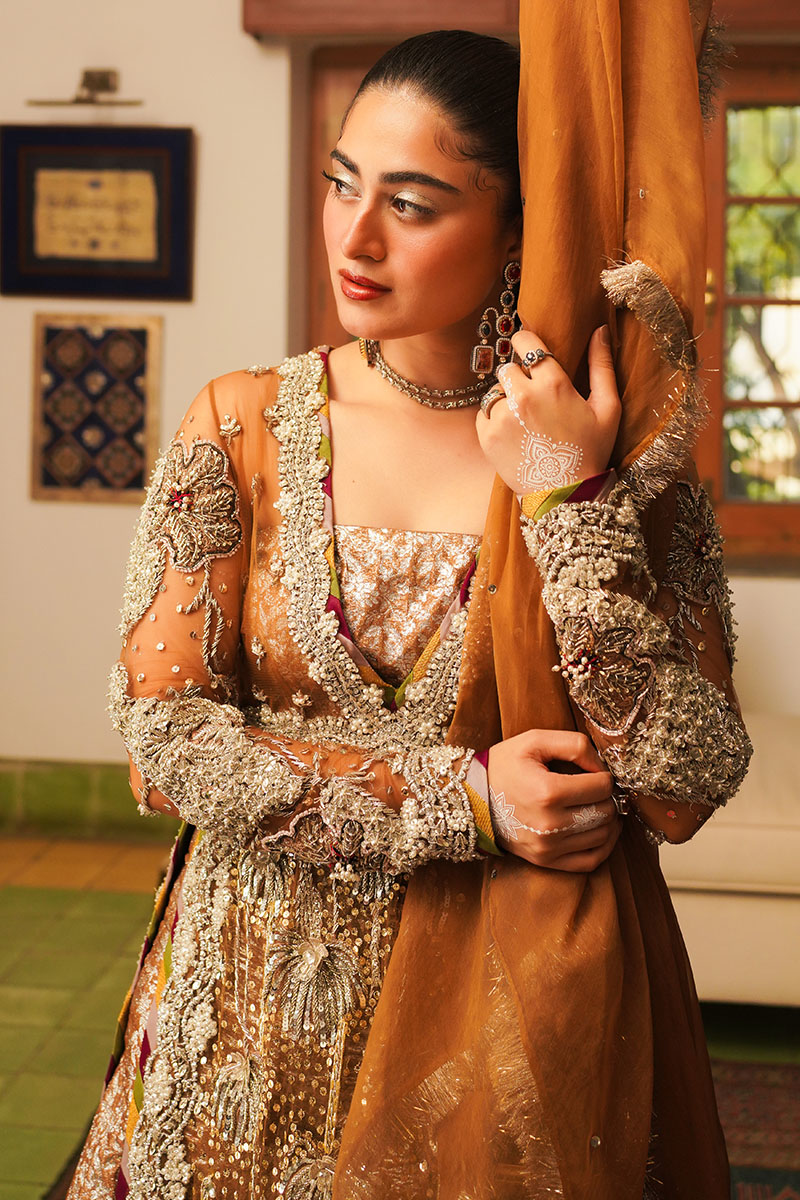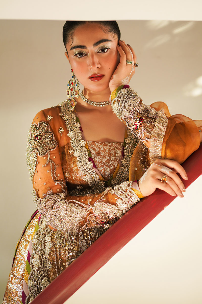 Step into the world of elegance with 'Zafraan,' a captivating formal ensemble in the enchanting shade of dull mustard yellow. This all-inclusive set includes a fully hand-embellished shirt, resplendent with nakshi dabka, resham thread, and shiny stones, exuding luxury. The bodice cut shirt, crafted in net, boasts long side slits and a scalloped border for an elegant and contemporary silhouette. Complementing this is a pair of shiny badal zari organza flared trousers. The ensemble is completed with an organza dupatta featuring a chan and kiran lace border, adding a touch of sophistication. Zafraan seamlessly blends traditional charm with modern embellishments, making a lasting statement.