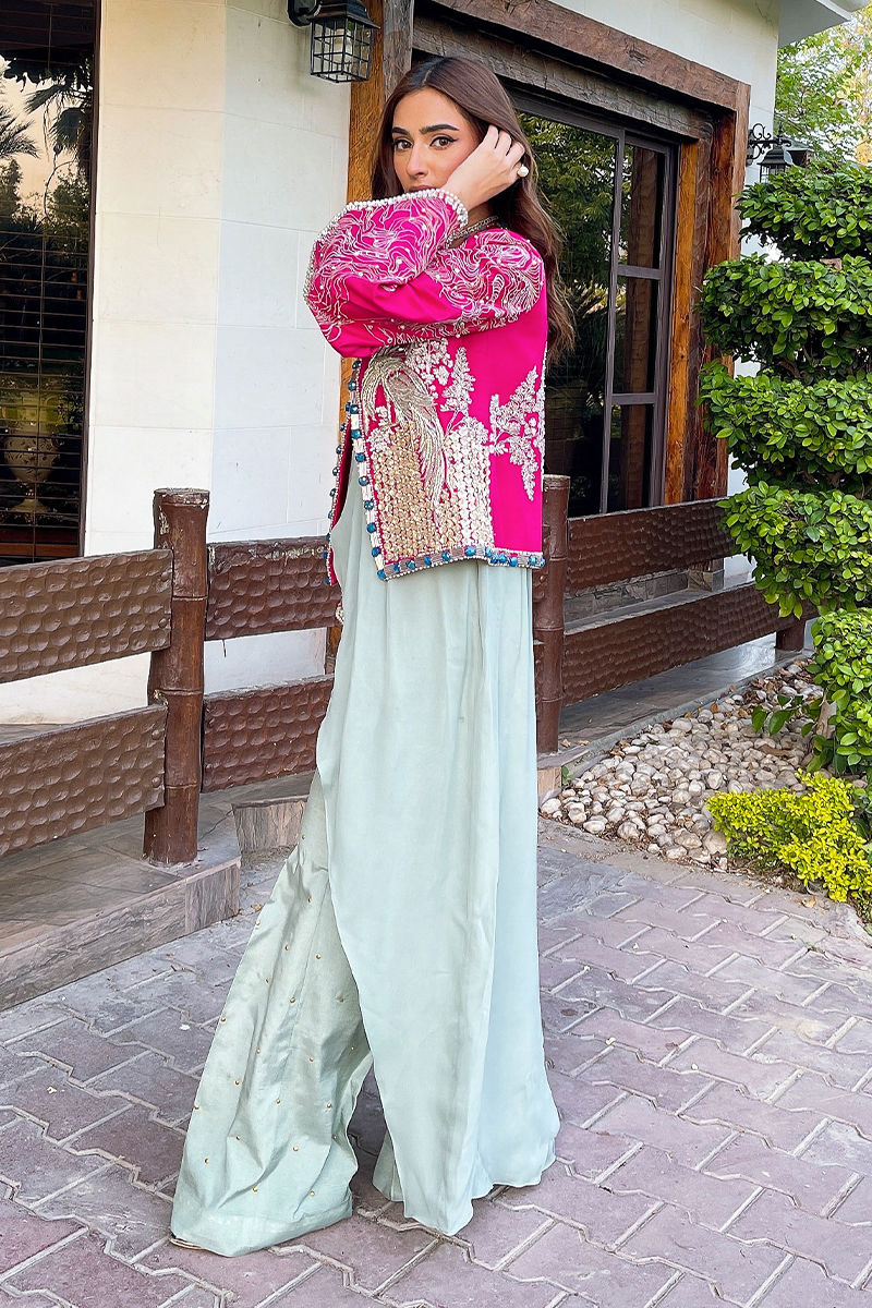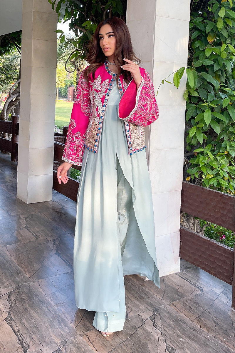 Hawt as pink is named after its extraordinary stylish cropped jacket in raw silk with structured flared sleeves. Fully hand embellished jacket loaded with embellishment details made in pure dabka and nakshi and tila and resham French knots with exclusive navy-coloured stones border. It comes with pleated flowy cut dress in chiffon paired with gold studded boot cut pants in pure Thai silk fabric. Back of the jacket is embellished too in tila and resham French knot.